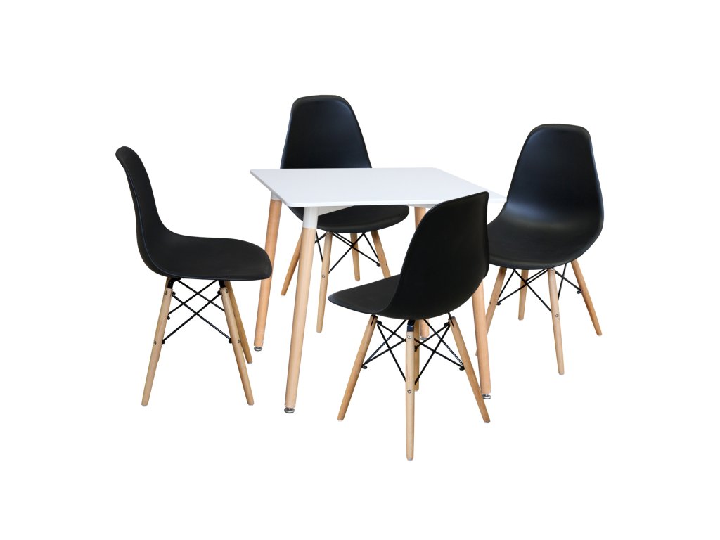 Jídelní stůl 80x80 UNO bílý + 4 židle UNO černé - jídelní stůl UNO 3150 a 4 jídelní židle UNO 3140 stůl: deska MDF, barevné provedení bílá kovová konstrukce, barevné provedení bílá kulaté nohy, materiál masiv buk nastavitelné plastové kluzáky s pochromovanou krytkou židle: materiál sedačky PP, barevné provedení černá kovová konstrukce, nohy materiál masiv buk výška sedu židle 46 cm rozměr stolu (š/h/v) 80 × 80 × 74 cm rozměr židle (š/h/v) 46 × 51 × 84 cmDoplňkové parametry