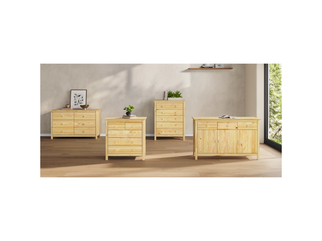 Komoda TORINO - materiál masiv borovice, lakované provedení 2 menší a 3 větší zásuvky s kovovými pojezdyBuďte první, kdo napíše příspěvek k této položce.