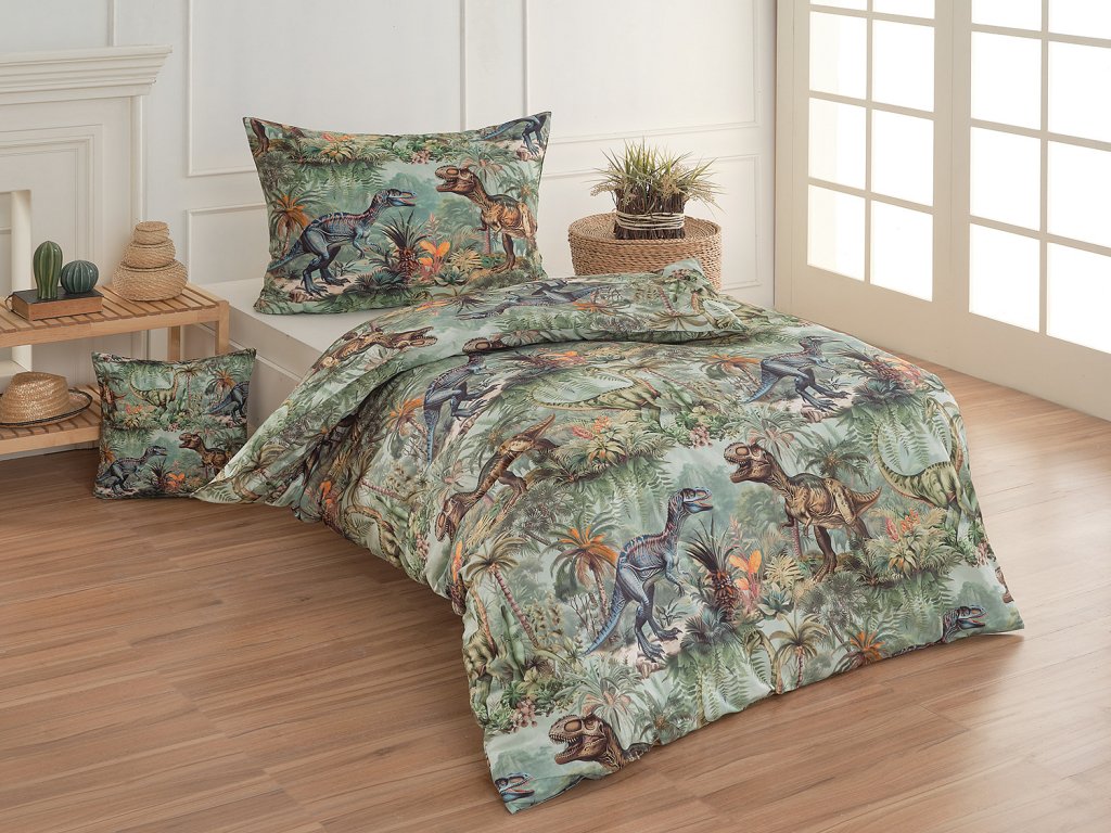 Dino Bavlna deluxe 1x 140/200, 1x 70/90 - Bavlněné povlečení Dino potěší všechny malé i větší milovníky jurského období. Povlak na polštář i na přikrývku je z obou stran stejný, povlak na polštář zdobí malé logo "M" v pravém dolním rohu. Povlečení je vyrobeno ze 100% bavlny a je opatřeno praktickým zipovým uzávěrem.Doplňkové parametry