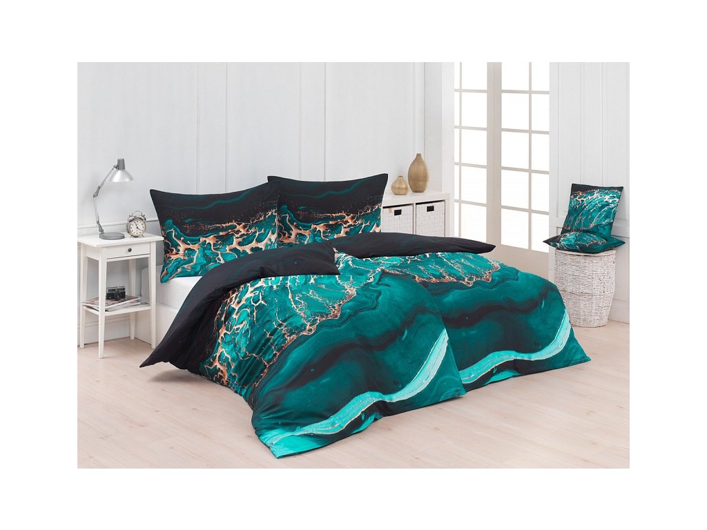 Freya Bavlna deluxe DIGITÁL 1x 140/220, 1x 70/90 - Nechte se okouzlit magickým spojením výrazných barev v energickém vzoru bavlněného ložního povlečení Freya. Paleta petrolejových tónů důmyslně protkaná zlatavými prvky vnese pozitivní energii do vaší ložnice. Povlak na přikrývku je z obou stran stejný, povlak na polštář zachycuje z každé strany trošku jiný motiv. Povlečení je opatřeno komfortním zipovým uzávěrem. bonieDoplňkové parametry