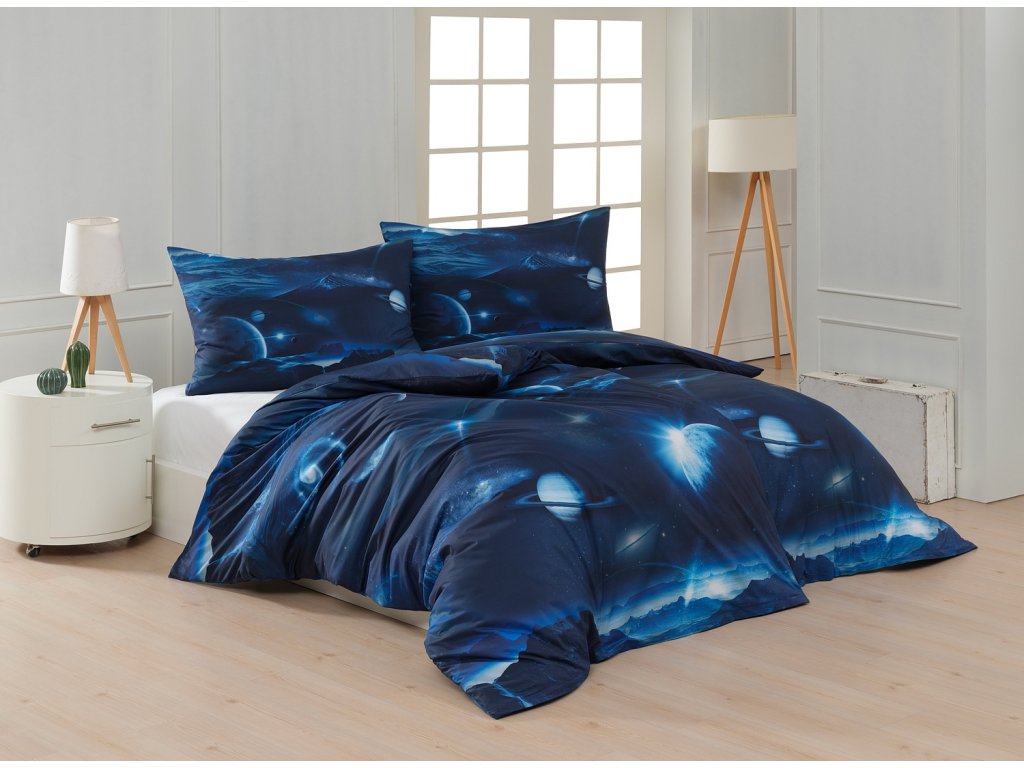 Galaxie Bavlna deluxe digitál 1x 140/220, 1x 70/90 - Objevte tajemství vesmíru přímo z vaší ložnice s hebkým bavlněným povlečením Galaxie. Tmavě modrý podklad zdobí motivy planet. Díky nejmodernějšímu digitálním tisku vyniká vzor v precizním detailu. Přeneste se do vesmíru každou noc a nechte své sny volně plynout mezi hvězdami. Povlak na polštář i na přikrývku je z obou stran stejný, povlečení je opatřeno komfortním zipovým uzávěrem.Doplňkové parametry