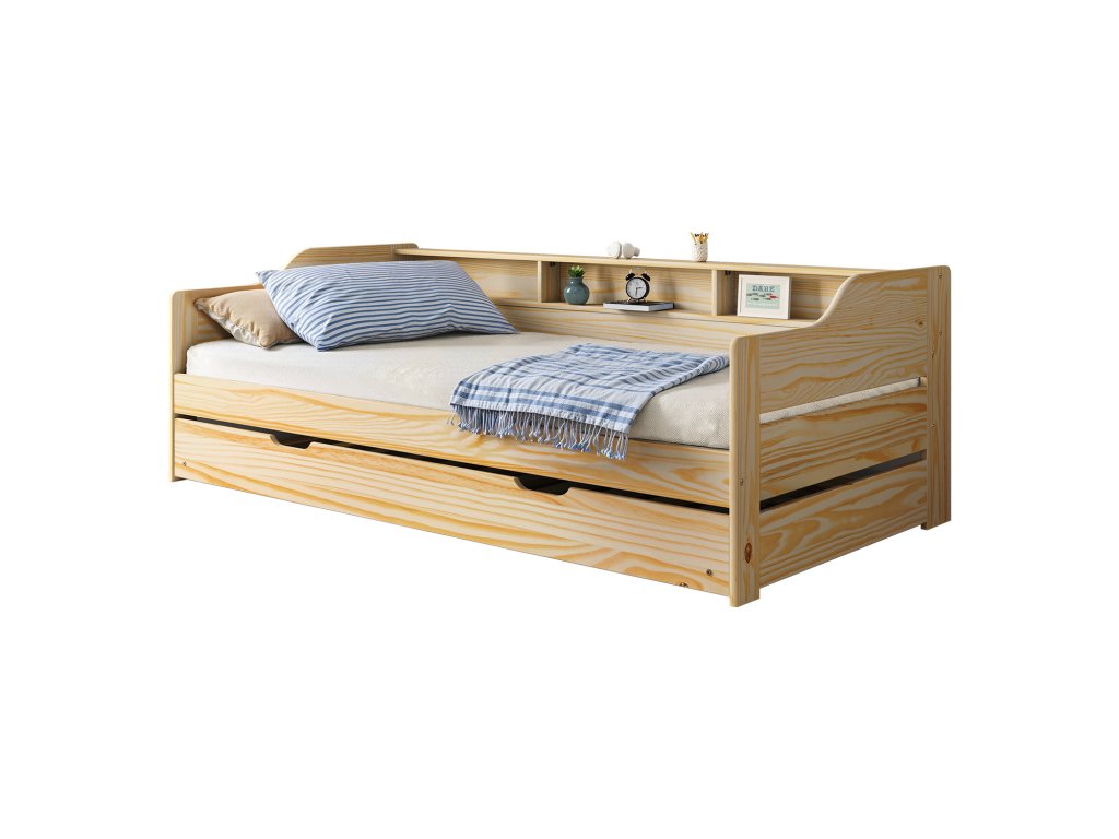 Jednolůžko s přistýlkou 8819 LILI lak - materiál masiv borovice, lakované provedení v zadní části otevřená police, v dolní části výsuvná přistýlka cena včetně roštů (dřevěné laťkové), matrace nejsou v ceně doporučený rozměr matrací 90 × 200 cmDoplňkové parametry