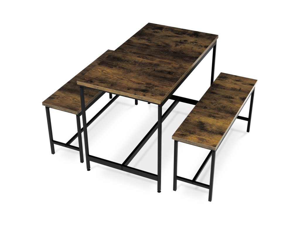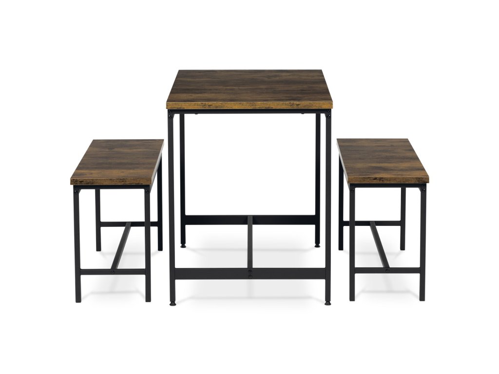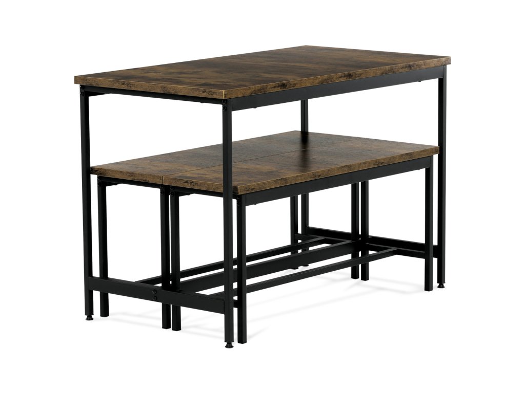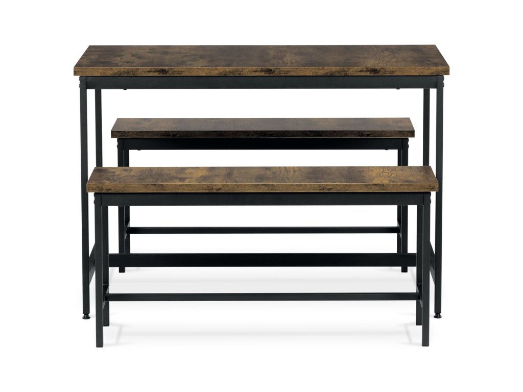 Jídelní set 1+2, rozměr stolu 110x60x75, rozměr lavice 98x30x47, MDF, barva staré dřevo AUT-G1175 OLW - Jídelní set značky Autronic v industriálním stylu je praktickým a stylovým řešením pro vaši jídelnu či kuchyň. Sestava obsahuje obdélníkový stůl a dvě lavice, které lze snadno zasunout pod stůl a ušetřit tak místo. Desky v dekoru starého dřeva dodávají příjemnou přírodní atmosféru, zatímco černé kovové nohy zajišťují stabilitu a moderní kontrast.Doplňkové parametry
