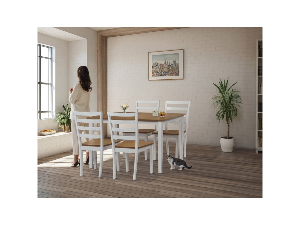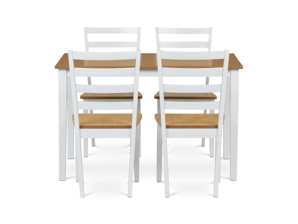 Jídelní set 1+4, rozměr stolu 120x75x75 cm, dýha, masivní nohy, dub, bílá VESPA OAK - Vneste do svého domova harmonii s elegantním jídelním setem značky Autronic. Kombinace bílých masivních nohou a desky v přírodním dubovém dekoru přidá vašemu interiéru moderní a svěží vzhled. Set zahrnuje stůl a čtyři židle, které nabízí pohodlí a stabilitu díky preciznímu zpracování z MDF materiálu s dýhou a masivním dřevem. Tento jídelní set je ideální volbou pro rodinné večeře i posezení s přáteli. Vytvořte si stylovou a funkční jídelnu s nadčasovým designem!Doplňkové parametry
