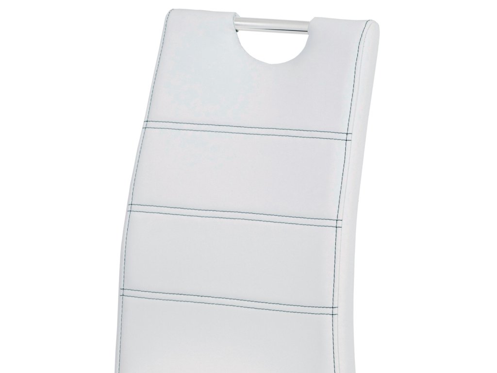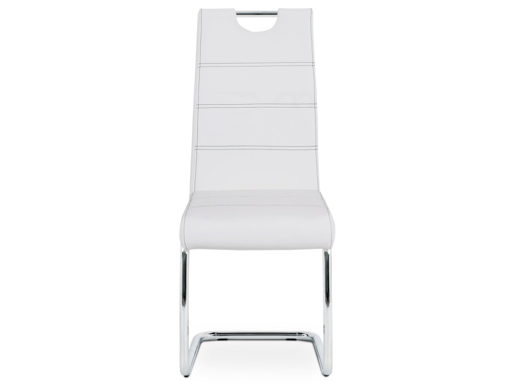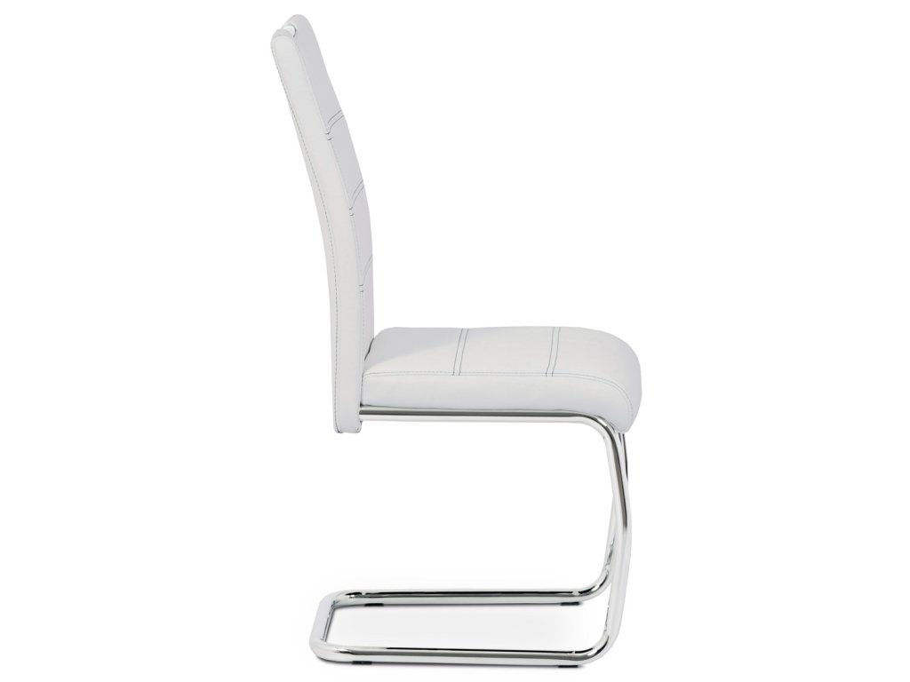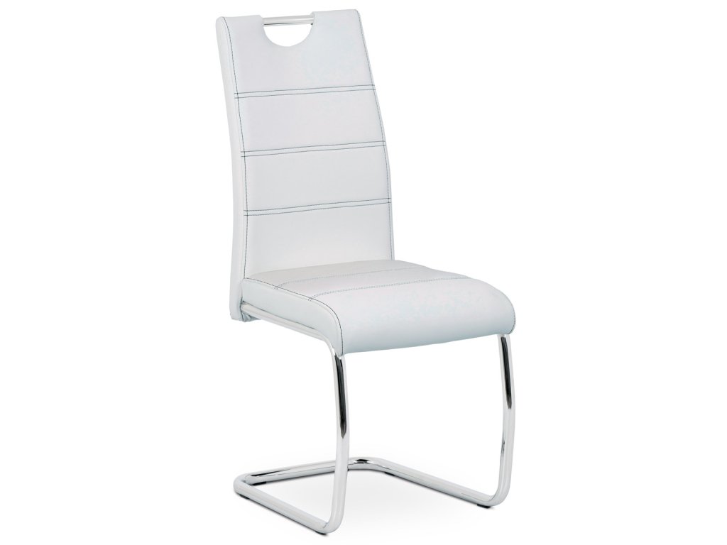 Jídelní židle, potah bílá ekokůže, černé prošití, kovová pohupová podnož, chrom HC-481 WT - Jídelní židle s označením HC-481 WT nabízí moderní design v kombinaci s praktickým provedením. Potah z bílé ekokůže je doplněn kontrastním černým prošitím, které podtrhuje čisté linie a dodává židli výrazný vzhled. Pohupová kovová podnož v chromovaném provedení zajišťuje stabilitu a zároveň příjemný pohyb při sezení. Sedák i opěradlo jsou ergonomicky tvarované a vyplněné měkkou výplní pro komfort během stolování. Absence područek umožňuje snadné zasunutí židle pod stůl a šetří prostor v jídelně.Doplňkové parametry
