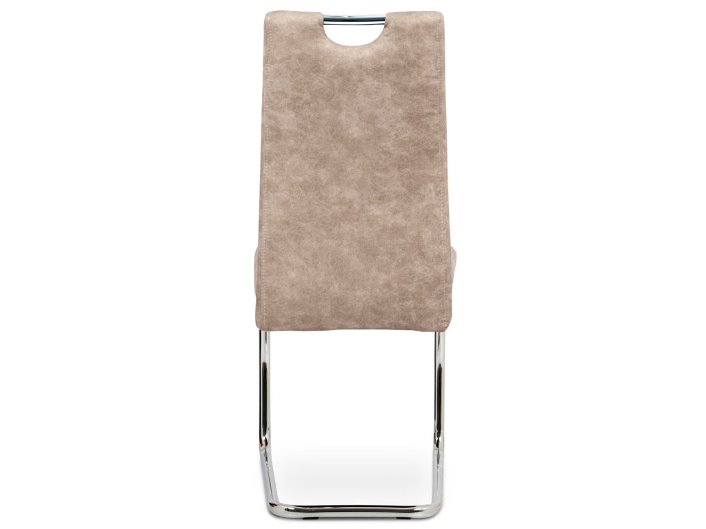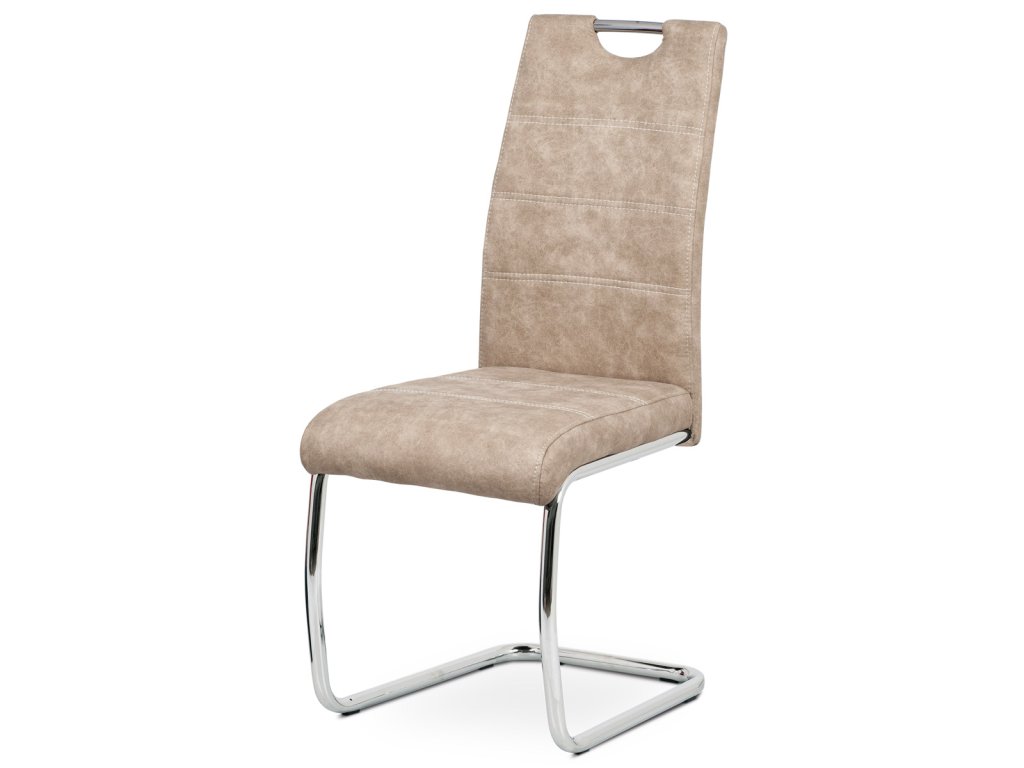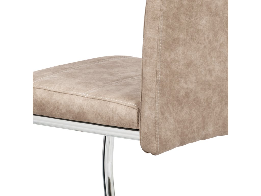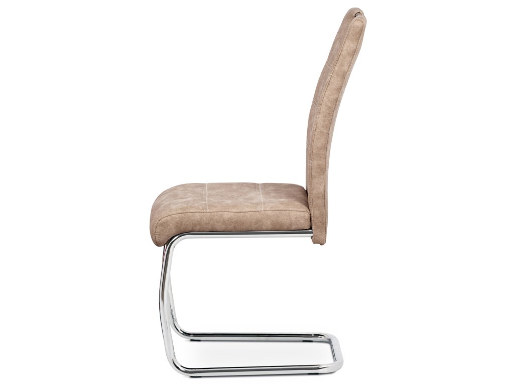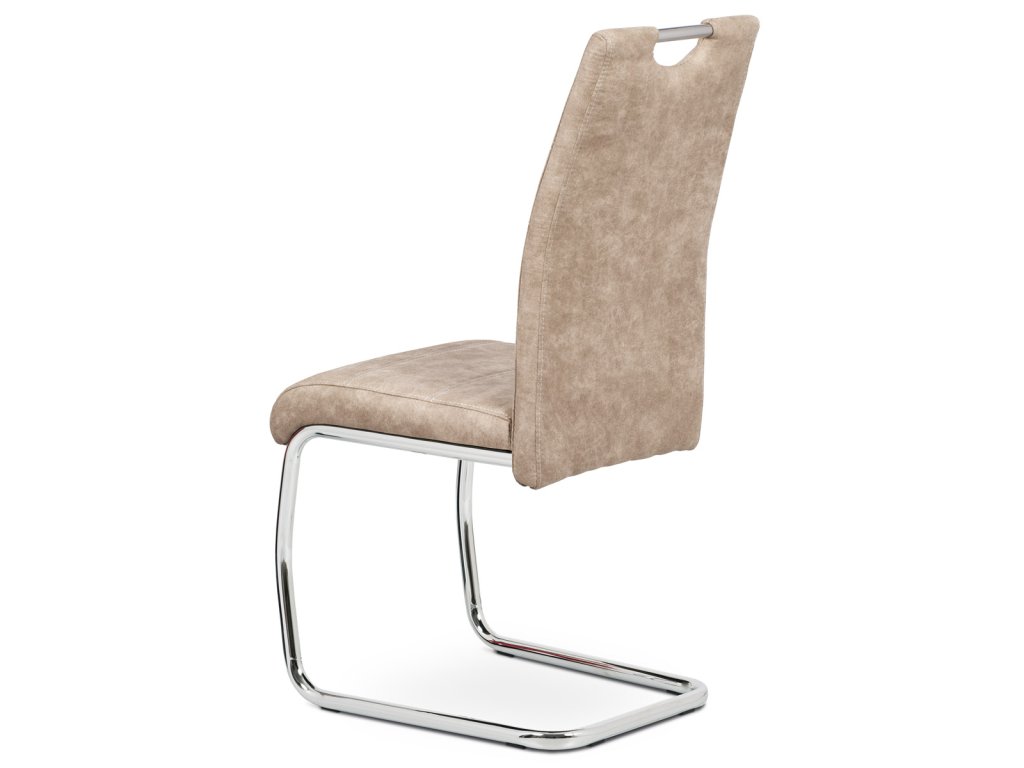 Jídelní židle, potah krémová látka COWBOY v dekoru vintage kůže, kovová chromova HC-483 CRM3 - Jídelní židle HC-483 CRM3 v béžovém odstínu s potahem z látky v dekoru vintage kůže kombinuje stylový vzhled s praktickými vlastnostmi. Čalounění z kvalitní látky připomínající kůži je příjemné na dotek a snadno se udržuje, zatímco pevná kovová chromovaná podnož zajišťuje stabilitu a odolnost. Židle je vybavena pohupovým mechanismem, který přispívá k pohodlí při sezení, a ergonomicky tvarovaným opěradlem s praktickým úchytem pro snadnou manipulaci. Absence područek umožňuje větší variabilitu použití a snadné zasunutí pod stůl. Celková výška a rozměry židle jsou navrženy tak, aby poskytovaly komfortní posezení během jídel i delších setkání.Doplňkové parametry