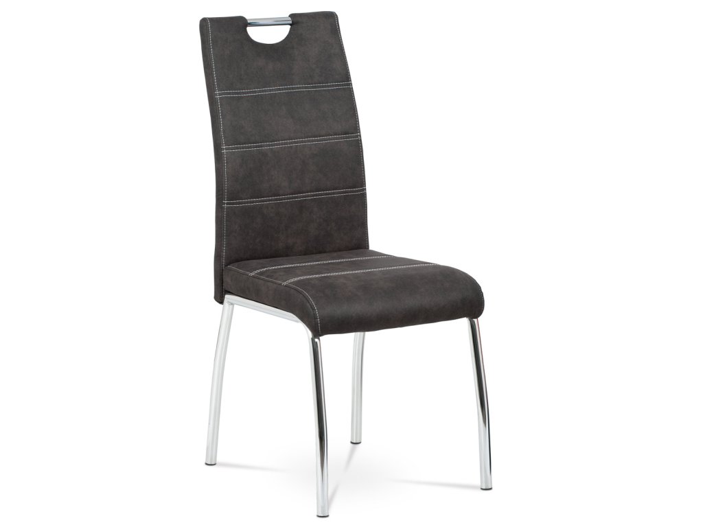 Jídelní židle, potah šedá látka COWBOY v dekoru vintage kůže, bílé prošití, kovo HC-486 GREY3 - Jídelní židle HC-486 GREY3 v šedém odstínu s potahem z látky v dekoru vintage kůže nabízí kombinaci moderního vzhledu a pohodlí. Sedák i opěradlo jsou čalouněné látkou s jemnou strukturou připomínající kůži, doplněné kontrastním bílým prošitím, které zvýrazňuje designové detaily. Pevné kovové nohy s chromovaným povrchem zajišťují stabilitu a dlouhou životnost. Židle nemá područky ani výškové nastavení, což ji činí praktickou pro jídelní prostory s omezeným prostorem. Je vhodná pro běžné užívání v domácnostech i komerčních provozech.Doplňkové parametry