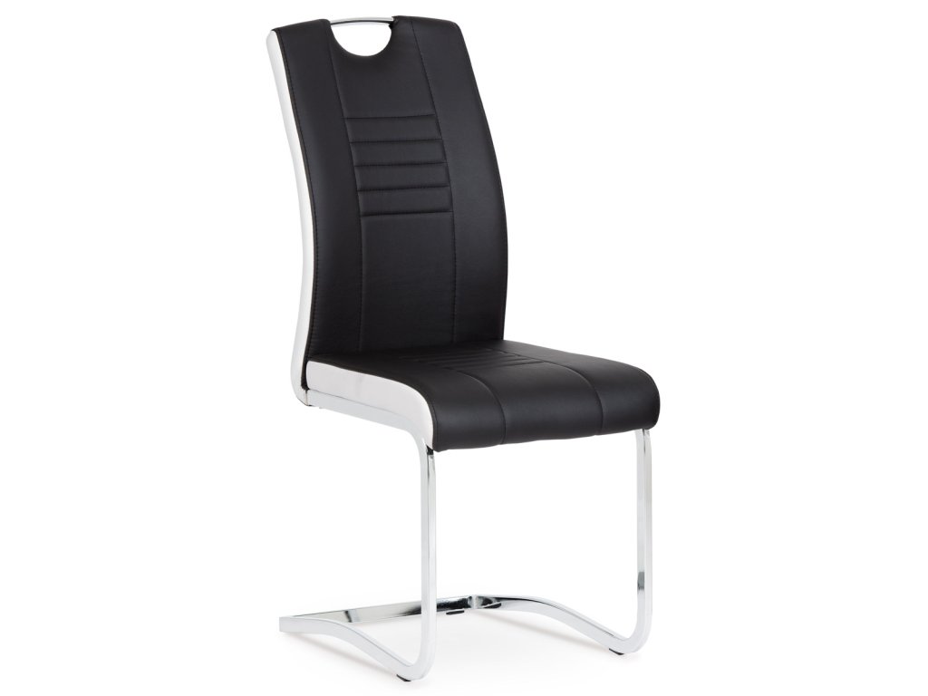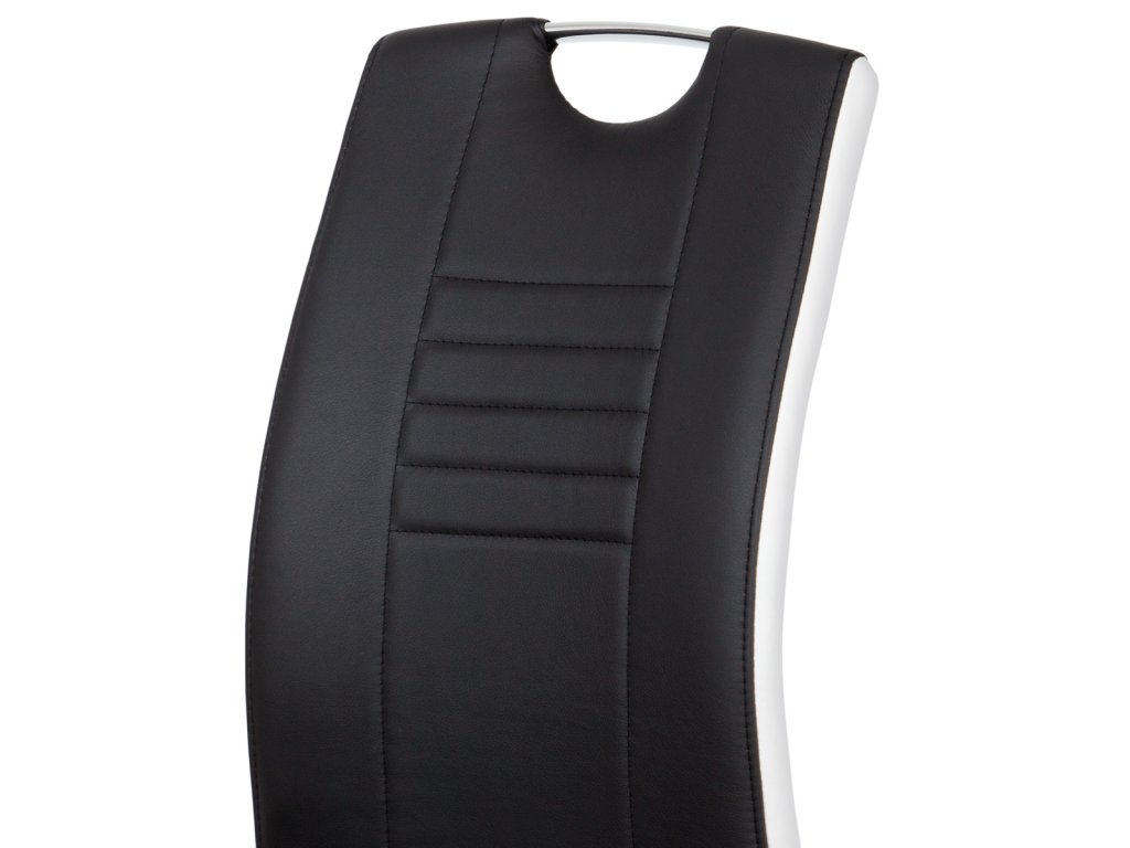 Jídelní židle chrom / koženka černá s bílými boky DCL-406 BK - Jídelní židle s označením DCL-406 BK kombinuje moderní design s praktickým provedením. Čalounění z kvalitní ekokůže v černé barvě je doplněno bílými boky, které zvýrazňují elegantní kontrast a čisté linie. Sedák i opěradlo jsou zdobeny designovým prošitím, které podtrhuje stylový vzhled a zároveň přispívá k větší odolnosti potahu. Pevná kovová podnož s chromovaným povrchem zajišťuje stabilitu a dlouhou životnost židle. Absence područek umožňuje snadné zasunutí pod stůl a šetří prostor v jídelně.Doplňkové parametry