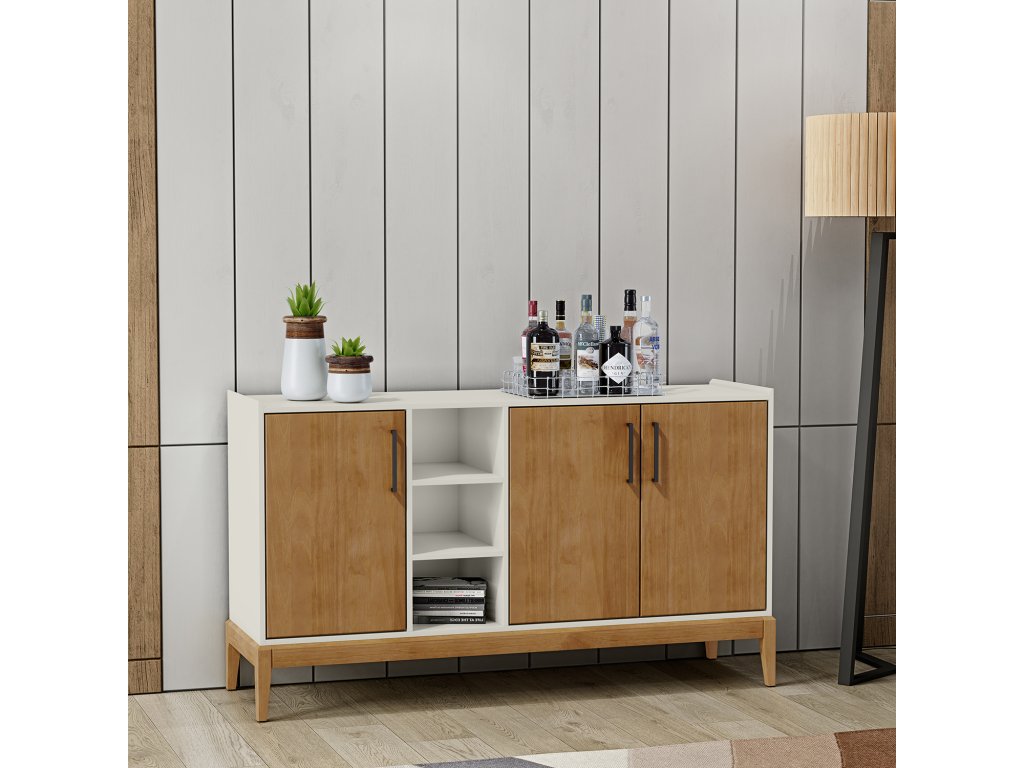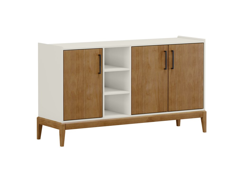 Komoda 3 dveře MILAO dub/bílá - materiál masiv borovice v kombinaci s MDF barevné provedení dub / bílá černé kovové úchytky 3 dvířka, 2 policeBuďte první, kdo napíše příspěvek k této položce.