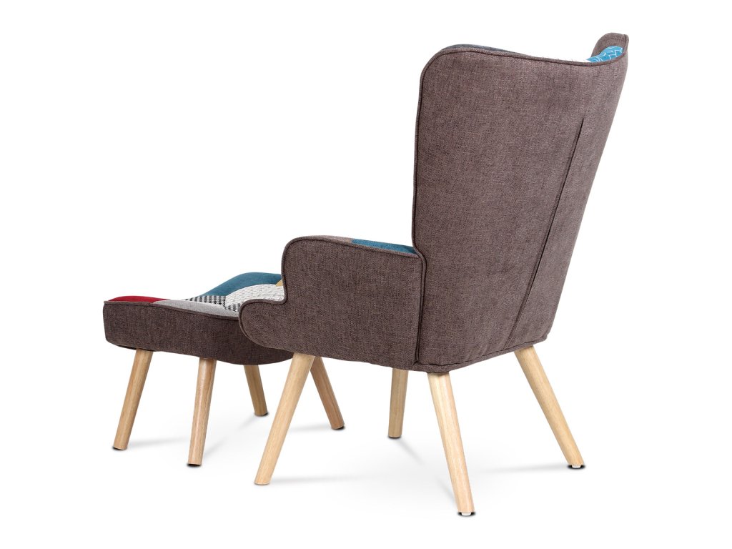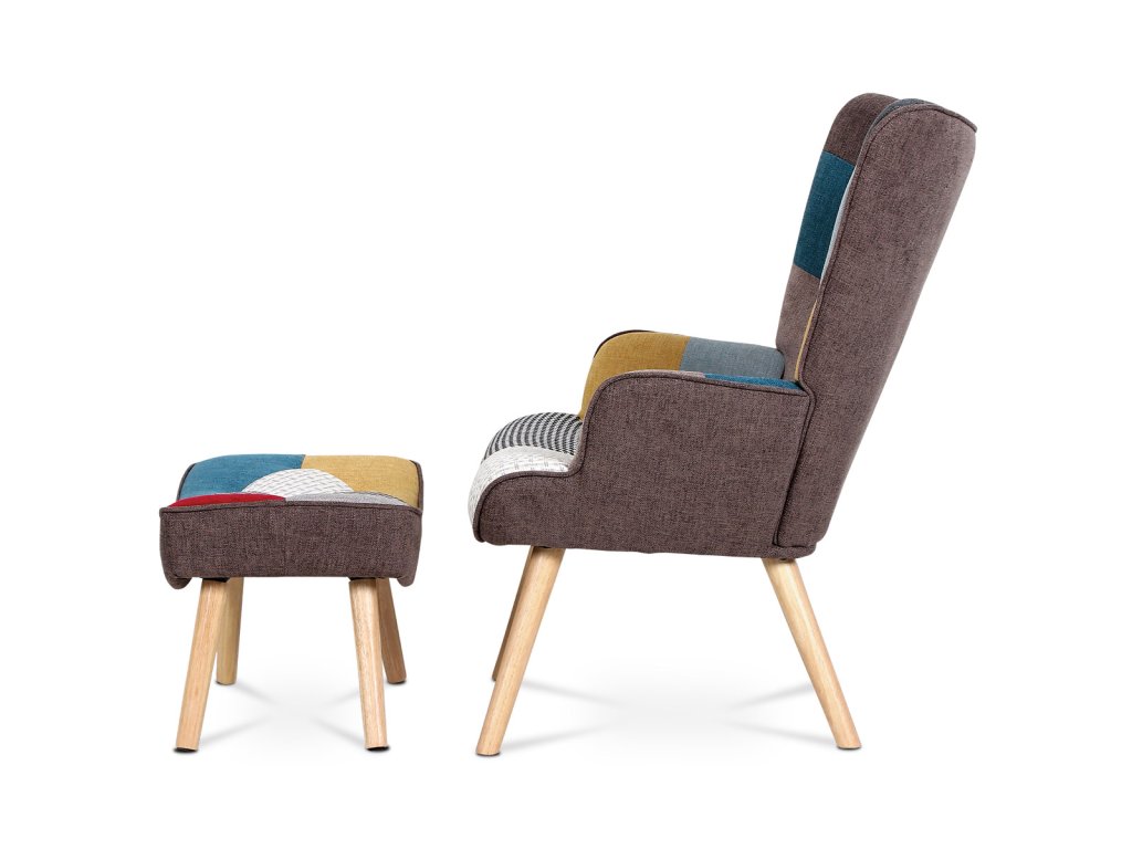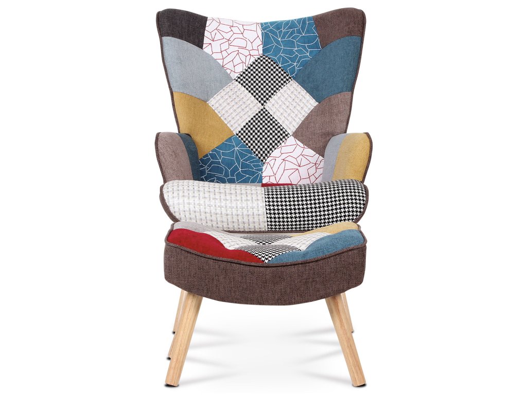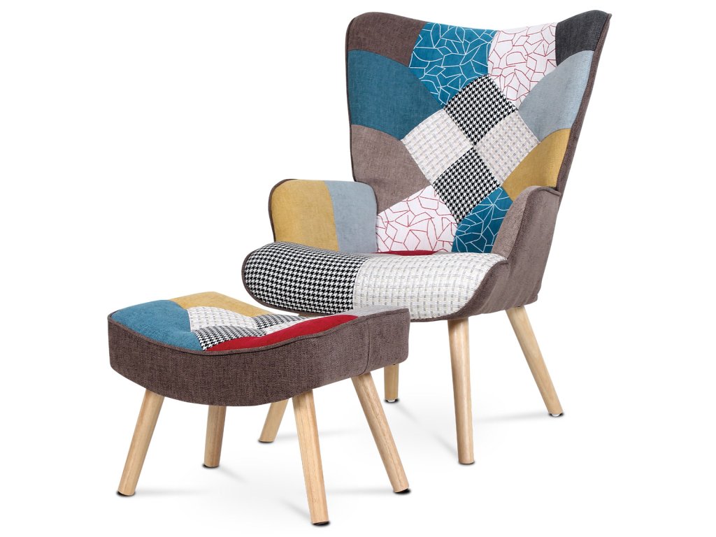 Křeslo "ušák" s podnožkou, potah patchwork látka, nohy masiv kaučukovník AK-305 PW2 - Křeslo ušák s podnožkou vyniká výrazným patchwork potahem z kvalitní látky, který kombinuje vícebarevné vzory a dodává interiéru osobitý charakter. Masivní nohy z kaučukovníku zajišťují stabilitu a dlouhou životnost, přičemž jejich přírodní odstín ladí s barevností čalounění. Ergonomicky tvarované opěradlo s vysokými bočními křídly poskytuje pohodlnou oporu pro záda i hlavu, což podporuje relaxaci. Součástí je také samostatný taburet s odpovídajícím designem, který umožňuje pohodlné podložení nohou. Křeslo je určeno pro použití v obývacích pokojích či relaxačních zónách, kde oceníte kombinaci komfortu a stylového provedení.Doplňkové parametry