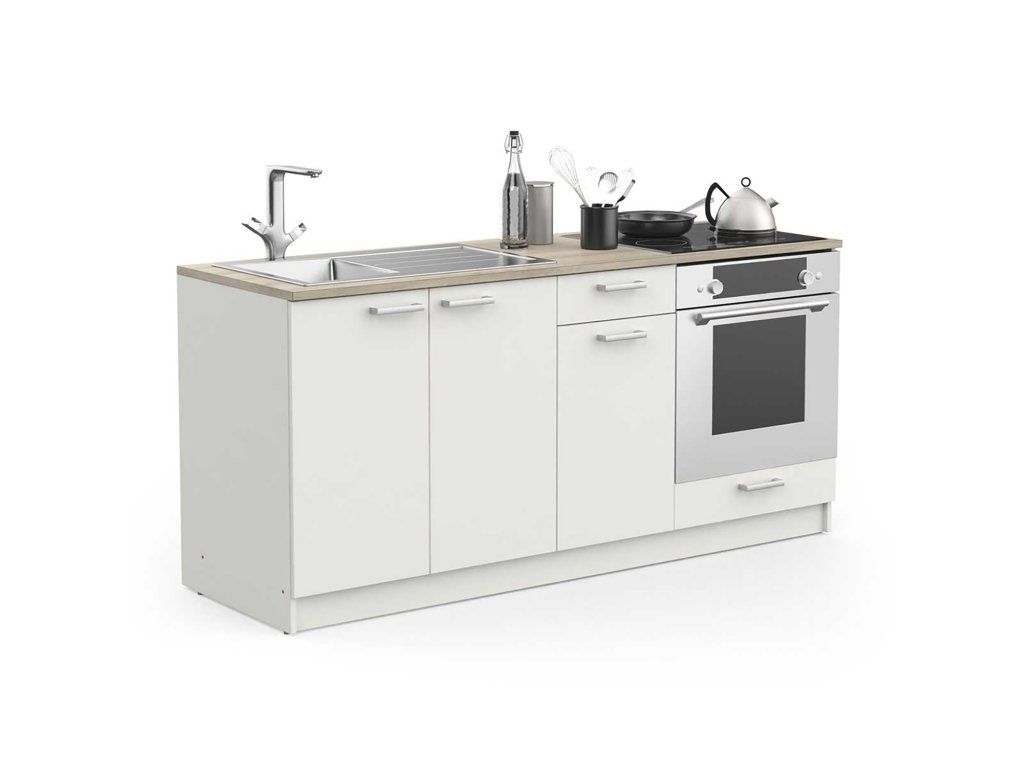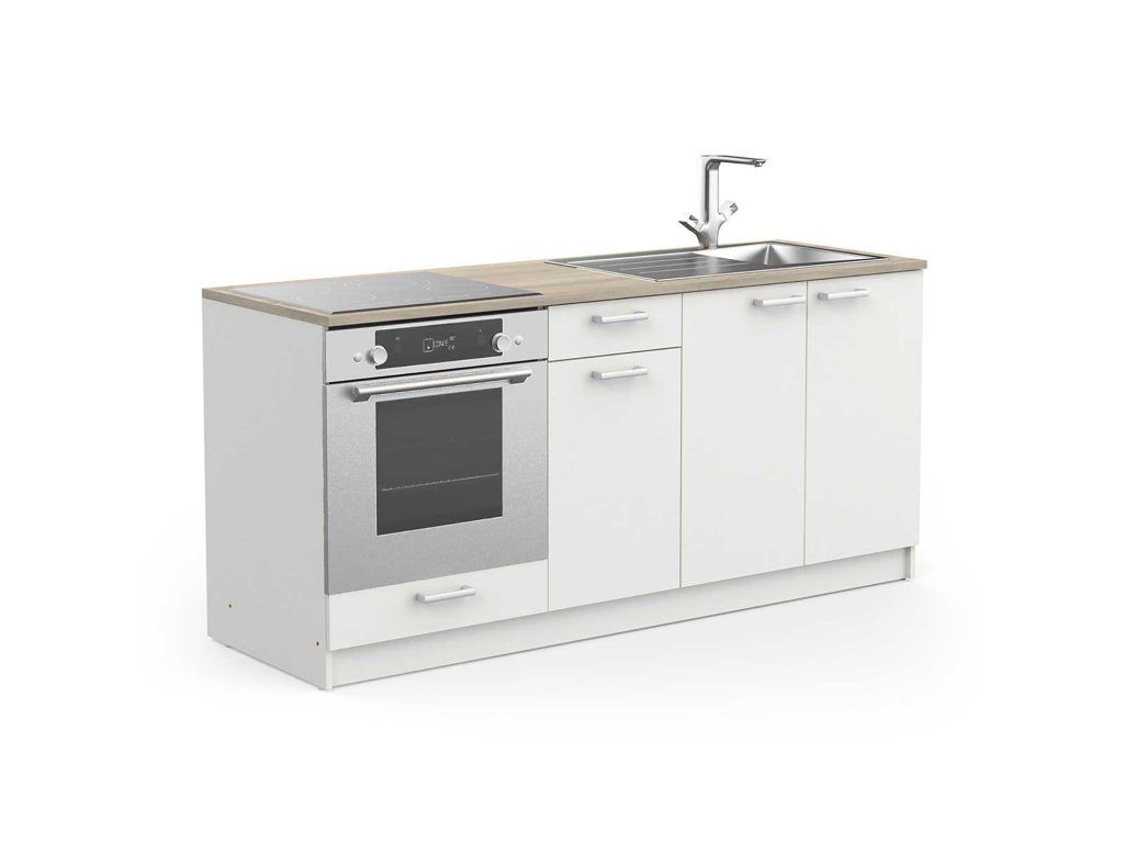 Kuchyňská linka COOKING dub/bílá - Kuchyňská linka COOKING s celkovou šířkou 180 cm je moderní a praktická sestava skříněk vyrobena z lamina v matném bílém odstínu s kombinací odstínu dub Kronberg, která skvěle zapadne do vašeho interiéru. Linka je navíc ošetřena voděodolným povrchem, který zajistí snadnou údržbu a dlouhou životnost celé kuchyně.
