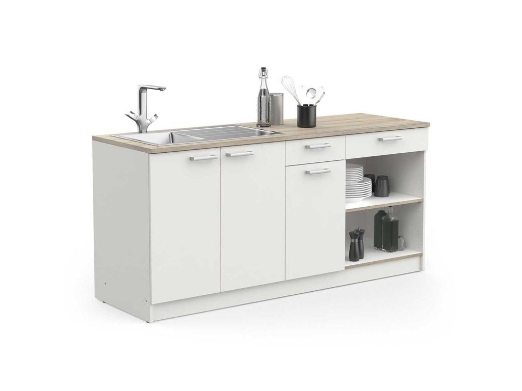 Trojdílná sestava skříněk obsahuje širokou skřínku se dvěmi dvířky, která je vhodná pro umístění dřezu a má zkrácenou zádovou část pro snadné vedení sanitárních potrubí. Střední úzkou skříňku s jedním dvířkem, jednou variabilní policí a jednou zásuvkou s kovovými pojezdy, která má maximální nosnost 1 kg. Na levé straně je vyobrazena skříňka, kterou můžete využít buďto pro vestavný spotřebič (například troubu), nebo jako policovou skříňku. V případě druhé možnosti můžete na střed skřínky vložit také polici. V obou případech lze do skřínky namontovat i šuplík s kovovými pojezdy, který můžete umístit do spodní nebo horní části skříňky. Zásuvka má maximální nosnost 2 kg a do skřínky lze umístit spotřebič o šířce až 60 cm.