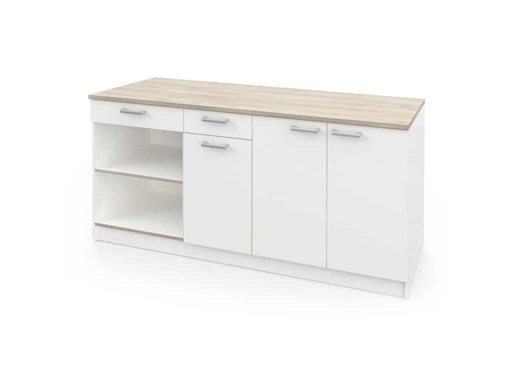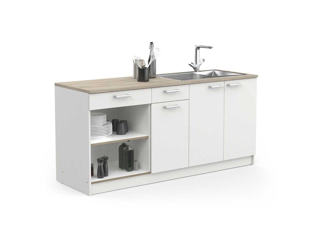 Horní deska má tloušťku 22 mm a je dostatečně pevná pro umístění dřezu, a to až do šířky 80 cm a varné desky do šířky 60 cm. Nastavitelné nožky kuchyně umožňují snadnou montáž a přizpůsobení výšky podle vašich preferencí.