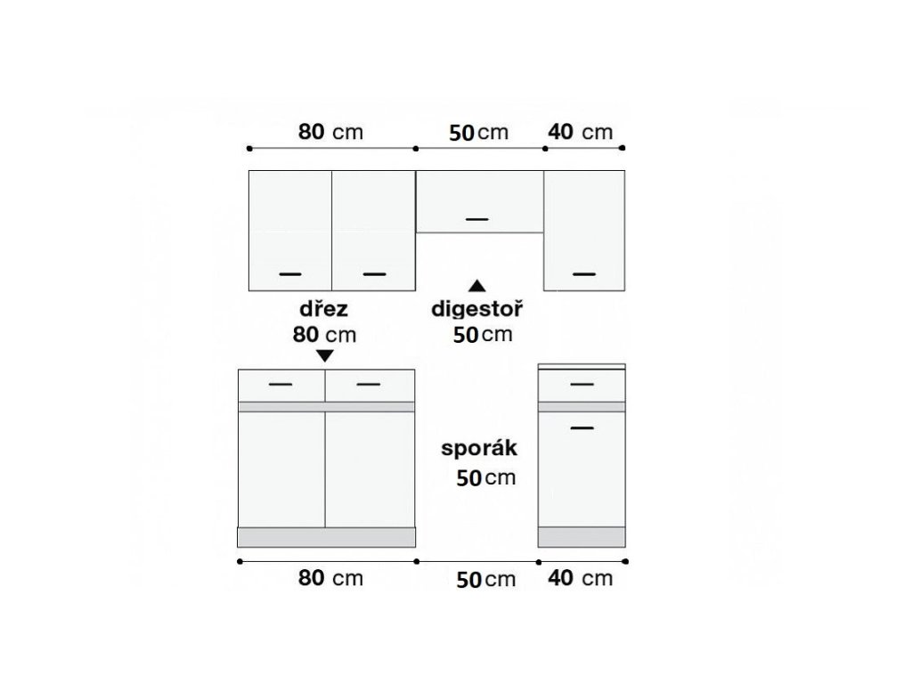 - Horní skříňky - dvoudveřová šíře 80 cm, jednodveřová šíře 40 cm, nad digestoř šíře 50 cm.