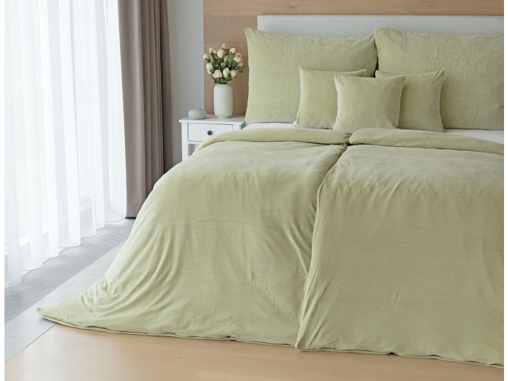 Mikroplyš bavlněný MÁTOVÝ 1x 140/220, 1x 70/90 - Přinášíme vám zbrusu novou kolekci bavlněného plyšového povlečení s vylepšenou strukturou! Bavlněný mikroplyš PREMIUM předčí vaše očekávání. Velur nové generace je mimořádně pevný, sametově hebký na dotek a zaručí vám zdravý spánek díky vysokému podílu prvotřídní bavlněné příze. Velur je označení pro různé druhy textilií s krátkým vlasem, které se vyznačují sametovým, jemně „chlupatým“ povrchem. Označení bavlněný mikroplyš používáme s cílem přiblížit povrchovou úpravu velurové tkaniny zákazníkům. Mikroplyš je hojně vyhledávaným materiálem, zejména v zimních měsících, obecně je však nabízen ve variantě 100% polyester (PES). Tento běžně dostupný syntetický materiál je sice hebký na dotek a může působit hřejivým dojmem, ale jeho užitné vlastnosti odpovídají charakteru syntetického vlákna - materiál je neprodyšný, nemá schopnost odvádět vlhkost a citlivějším jedincům může po čase způsobit nežádoucí kožní či jiné obtíže. Bavlněný mikroplyš naší výroby se pyšní vysokým podílem bavlny (80%), kdy zbývajících 20% PES tvoří spodní strukturu pružné tkaniny. Údržba: Povlečení doporučujeme prát při teplotě 40°C. Nová vylepšená struktura umožňuje sušení v sušičce, která při prvním praní snadno odstraní zbytková vlákna z výroby. Tím se minimalizuje počáteční sklon k "prášení", který je u velurových tkanin běžný. Velurové povlečení je nenáročné na údržbu a nevyžaduje žehlení. Gramáž: 200 g/m2Barva: světle zelená Kolekce velurového povlečení PREMIUM splňuje kritéria mezinárodní certifikace Oeko-Tex Standard 100. U velurového povlečení neprovádíme zákaznické úpravy!Doplňkové parametry