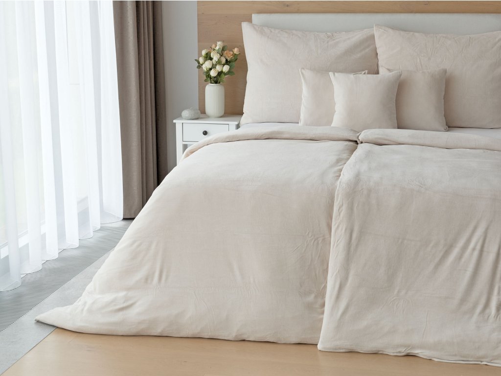 Mikroplyš bavlněný NARUR 1x 140/220, 1x 70/90 - Přinášíme vám zbrusu novou kolekci bavlněného plyšového povlečení s vylepšenou strukturou! Bavlněný mikroplyš PREMIUM předčí vaše očekávání. Velur nové generace je mimořádně pevný, sametově hebký na dotek a zaručí vám zdravý spánek díky vysokému podílu prvotřídní bavlněné příze. Velur je označení pro různé druhy textilií s krátkým vlasem, které se vyznačují sametovým, jemně „chlupatým“ povrchem. Označení bavlněný mikroplyš používáme s cílem přiblížit povrchovou úpravu velurové tkaniny zákazníkům. Mikroplyš je hojně vyhledávaným materiálem, zejména v zimních měsících, obecně je však nabízen ve variantě 100% polyester (PES). Tento běžně dostupný syntetický materiál je sice hebký na dotek a může působit hřejivým dojmem, ale jeho užitné vlastnosti odpovídají charakteru syntetického vlákna - materiál je neprodyšný, nemá schopnost odvádět vlhkost a citlivějším jedincům může po čase způsobit nežádoucí kožní či jiné obtíže. Bavlněný mikroplyš naší výroby se pyšní vysokým podílem bavlny (80%), kdy zbývajících 20% PES tvoří spodní strukturu pružné tkaniny. Údržba: Povlečení doporučujeme prát při teplotě 40°C. Nová vylepšená struktura umožňuje sušení v sušičce, která při prvním praní snadno odstraní zbytková vlákna z výroby. Tím se minimalizuje počáteční sklon k "prášení", který je u velurových tkanin běžný. Velurové povlečení je nenáročné na údržbu a nevyžaduje žehlení. Gramáž: 200 g/m2Barva: přírodní béžová Kolekce velurového povlečení PREMIUM splňuje kritéria mezinárodní certifikace Oeko-Tex Standard 100. U velurového povlečení neprovádíme zákaznické úpravy!Doplňkové parametry
