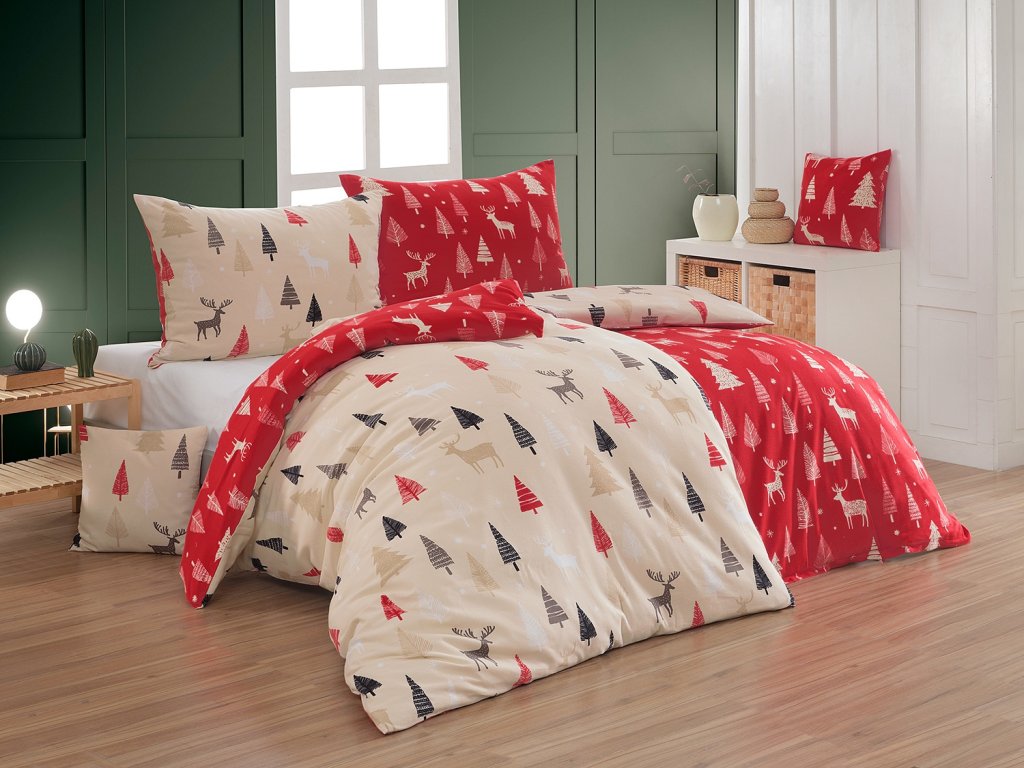 Patti Flanel premium 1x 140/200, 1x 70/90 - Materiál: 100% bavlna Povlak na polštář i na přikrývku je z každé strany jinak barevný, jak je vyobrazeno na fotografii. Podkladová strana spodní strany je vánočně červená s béžovými motivy, vrchní straně dominuje béžový podklad s barevnými motivy. Povlak na polštář zdobí malé logo "M" v pravém dolním rohu. Povlečení je opatřeno komfortním zipovým uzávěrem.Doplňkové parametry