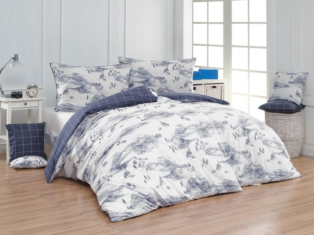 Polar blue 024 Bavlna deluxe 1x 140/220, 1x 70/90 - Bavlněné povlečení Polar Blue vnese do vaší ložnice svěžest a navodí tu správnou zimní atmosféru. Vrchní stranu povlečení zdobí kresba horské krajiny v paletě modrošedých tónů na sněhově bílém podkladu. Spodní stranu tvoří kostka s bílou konturou na modrošedém podkladu. Díky tomuto oblíbenému oboustrannému provedení můžete při stlaní hravě experimentovat! Materiál: 100% bavlna Povlak na polštář i na přikrývku je z každé strany jiný, povlečení je opatřeno komfortním zipovým uzávěrem. Povlaky na polštářky 40/40 cm se šijí ze stejné látky jako ložní povlečení, vzhledem k rozmanitosti vzoru může být každý povláček jiný. RŮZNÉ VARIANTY!Doplňkové parametry