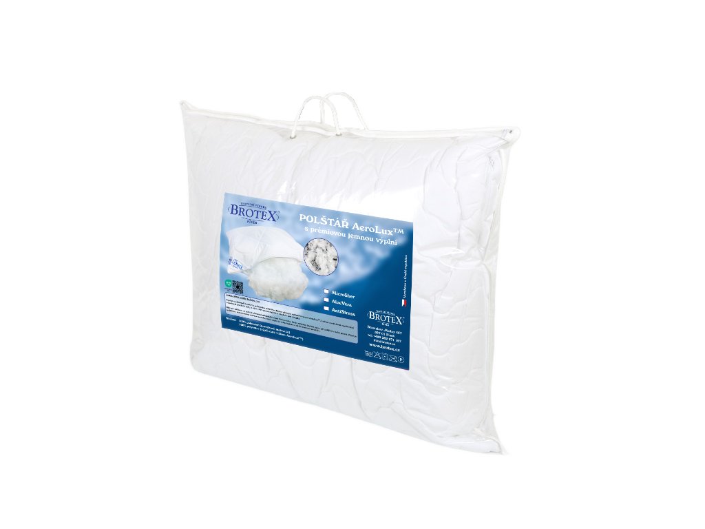 Prémiová výplň AeroLux™ – alternativa prachového peří Plně protialergická náplň Samostatný vnitřní povlak výplně Měkký a přizpůsobivý – ideální při potížích s krční páteří Výborná prodyšnost a tvarová stálost Hypoalergenní materiál Snadná údržba Rozměr 70×90 cm – ideální pro klasické povlečení Materiál: