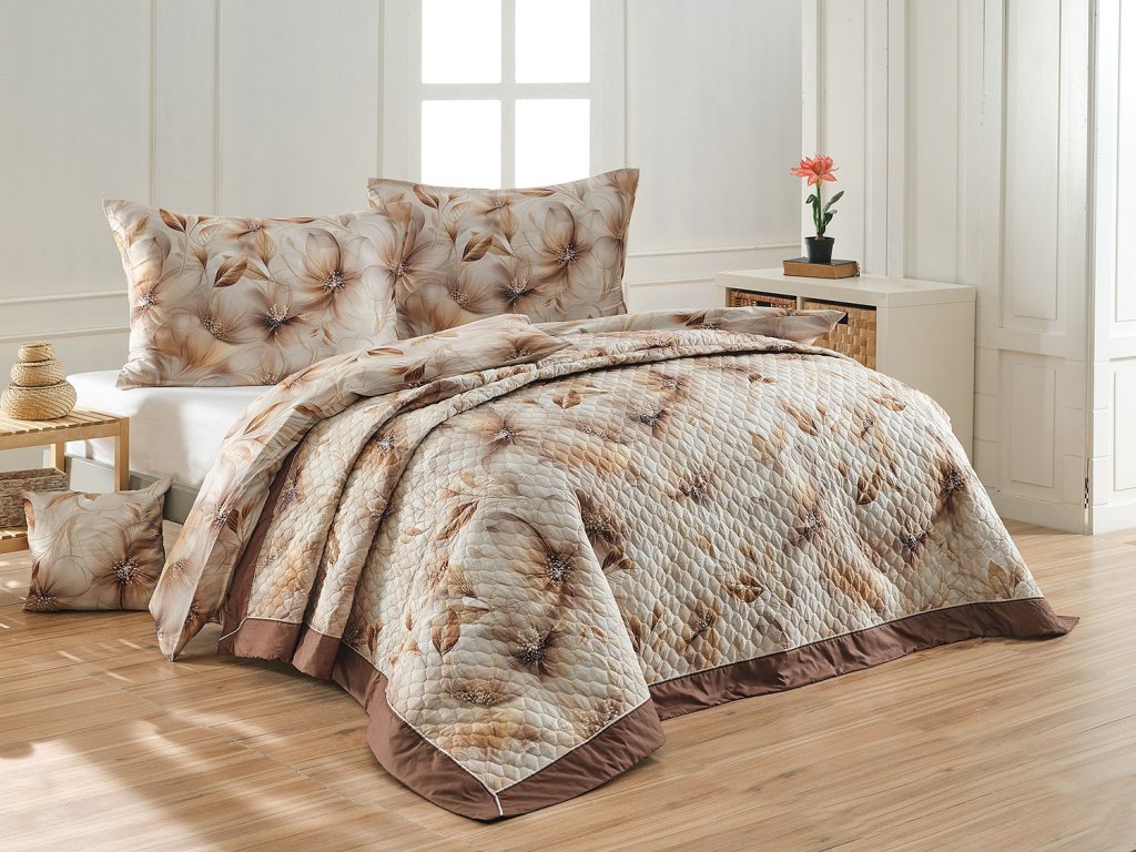 Přehoz Armide dvoulůžko 220/240 - Přehoz Armide je jedinečný estetický a praktický doplněk, se kterým bude vaše postel vždy dokonale ustlaná. Jako výplň je použito vrstvené duté vlákno se sníženou gramáží. Povrchový materiál tvoří 100% bavlněná látka ve stejném dezénu jako ložní povlečení. Po celé ploše je aplikováno ozdobné prošití, aby se zajistila stabilita výplně a současně podtrhl celkový vzhled přehozu. Gramáž výplně: 120 g/m2 Barevné provedení: Elegantní florální motiv v hřejivé paletě béžových a hnědých tónů, který je z obou stran přehozu stejný. Okraje zdobí hnědé lemování doplněné na vrchní straně paspulí v přírodní béžové barvě. Údržba: přehozy je možné prát v dostatečně objemné pračce při teplotě 40°CDoplňkové parametry