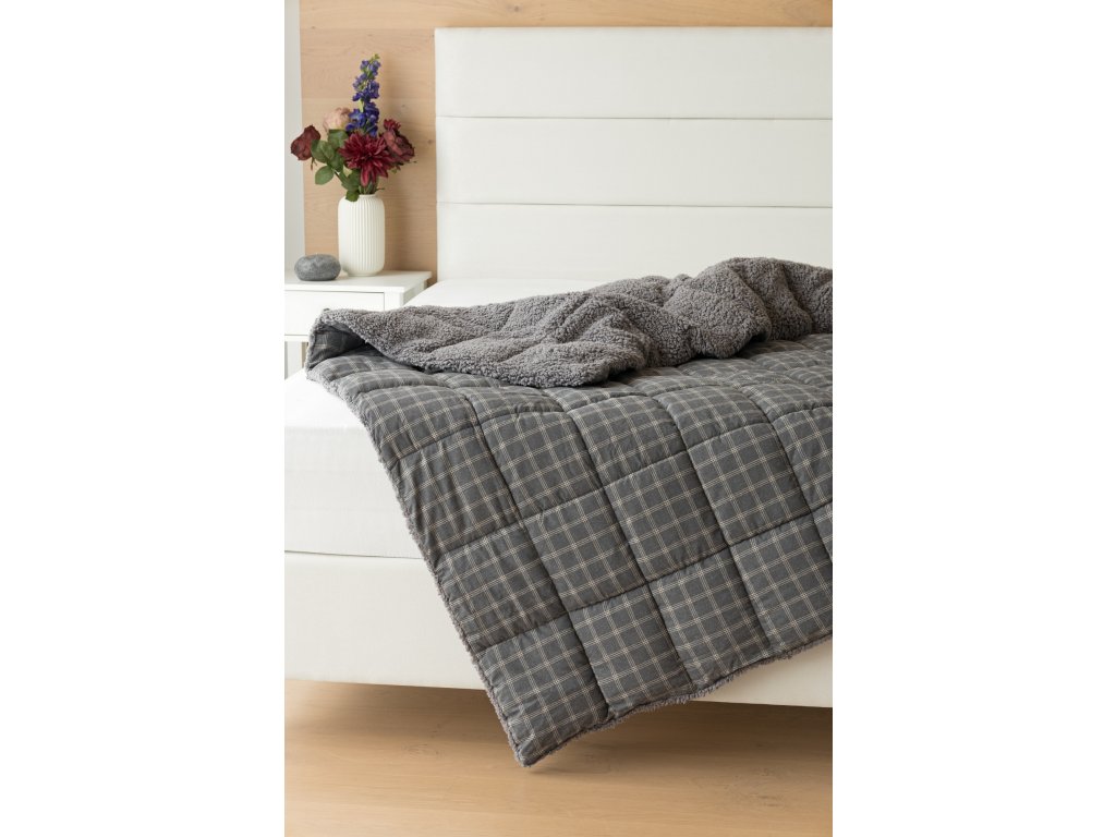 Přikrývka Matějovský ARNO 140x200 - Štěstí přeje připraveným! Nenechte se zaskočit chladným počasím a dopřejte si zasloužený odpočinek v teple... Nová kolekce prošívaných flanelových přikrývek s beránkem vám zajistí jedinečný tepelný komfort a úžasné pohodlí během sychravých dnů, chladných večerů a zimních nocí. Vrchní stranu prošívané deky tvoří hebký flanel s jemným chloupkem, spodní stranu pokrývá hřejivý nadýchaný beránek. Vnitřní výplň s plošnou gramáží 250 g/m2 tvoří mikrogelové polyesterové nano vlákno, které je prodyšné, lehké a nesléhá. Stabilitu výplně zajišťuje precizní prošití po celé ploše. Elegantní vzor Arno s jemnou krémovou kostkou na antracitově šedém podkladu doplňuje barevně sladěný beránek v tmavě šedém odstínu. K přikrývce lze dokoupit také polštář ve stejném designu. Díky nízké gramáži můžete tyto praktické přikrývky využít celoročně. V chladnějším období se zachumláte do hebkého beránka, který zajišťuje vynikající tepelnou izolaci, v teplejších měsících přikrývku jednoduše otočíte. Materiálové složení: Vrchní strana: směs recyklované bavlny a polyesteru Spodní strana: 100% polyester Výplň: 100% polyester Údržba: Přikrývku lze prát v dostatečně objemné pračce při teplotě 40°C. Sušení v sušičce rozhodně nedoporučujeme, nicméně výhodou použitých materiálů je, že velmi rychle schnou. Kolekce beránkových lůžkovin splňuje kritéria mezinárodní certifikace Oeko-Tex Standard 100. Štěstí přeje připraveným! Nenechte se zaskočit chladným počasím a dopřejte si zasloužený odpočinek v teple... Nová kolekce prošívaných flanelových přikrývek s beránkem vám zajistí jedinečný tepelný komfort a úžasné pohodlí během sychravých dnů, chladných večerů a zimních nocí. Vrchní stranu prošívané deky tvoří hebký flanel s jemným chloupkem, spodní stranu pokrývá hřejivý nadýchaný beránek. Vnitřní výplň s plošnou gramáží 250 g/m2 tvoří mikrogelové polyesterové nano vlákno, které je prodyšné, lehké a nesléhá. Stabilitu výplně zajišťuje precizní prošití po celé ploše. Elegantní vzor Arno s jemnou krémovou kostkou na antracitově šedém podkladu doplňuje barevně sladěný beránek v tmavě šedém odstínu. K přikrývce lze dokoupit také polštář ve stejném designu. Díky nízké gramáži můžete tyto praktické přikrývky využít celoročně. V chladnějším období se zachumláte do hebkého beránka, který zajišťuje vynikající tepelnou izolaci, v teplejších měsících přikrývku jednoduše otočíte. Materiálové složení: Vrchní strana: směs recyklované bavlny a polyesteru Spodní strana: 100% polyester Výplň: 100% polyester Údržba: Přikrývku lze prát v dostatečně objemné pračce při teplotě 40°C. Sušení v sušičce rozhodně nedoporučujeme, nicméně výhodou použitých materiálů je, že velmi rychle schnou. Kolekce beránkových lůžkovin splňuje kritéria mezinárodní certifikace Oeko-Tex Standard 100.Doplňkové parametry