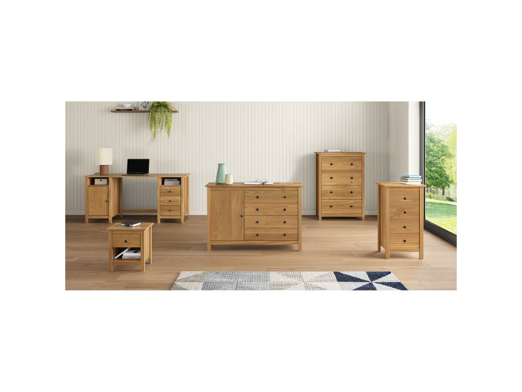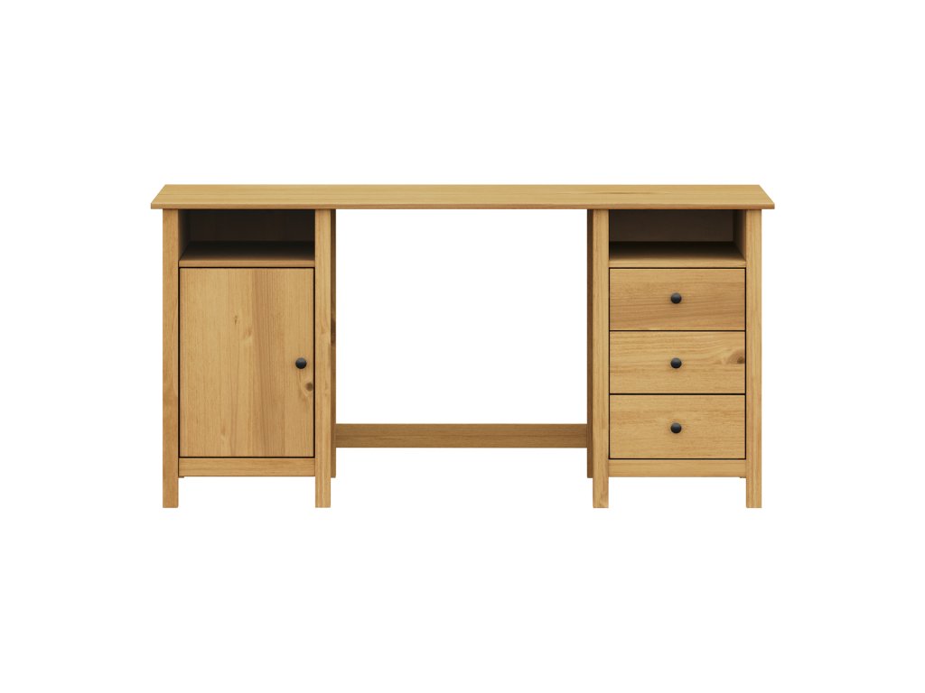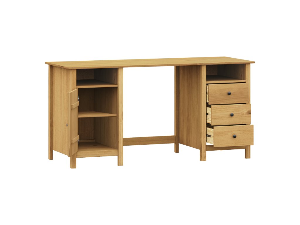 Psací stůl TORINO vosk - materiál masiv borovice voskovaná v medovém odstínu kovové úchytky v barevném provedení černěná mosaz 2 otevřené police, 1 dvířka a 3 zásuvky s kovovými pojezdyBuďte první, kdo napíše příspěvek k této položce.