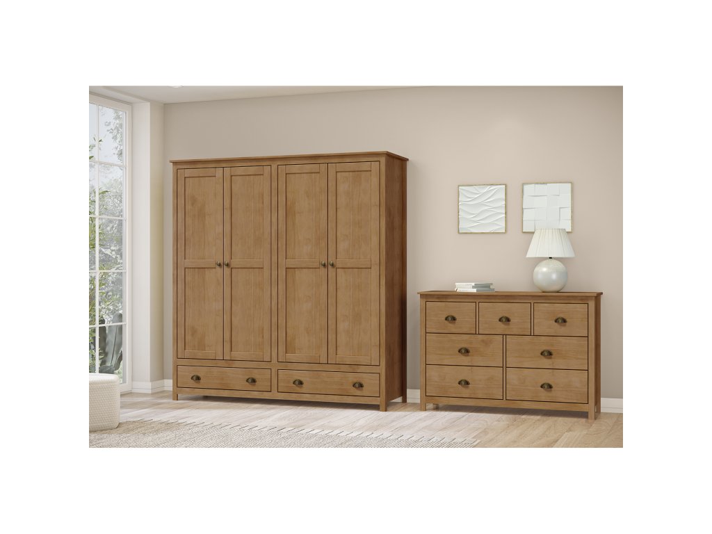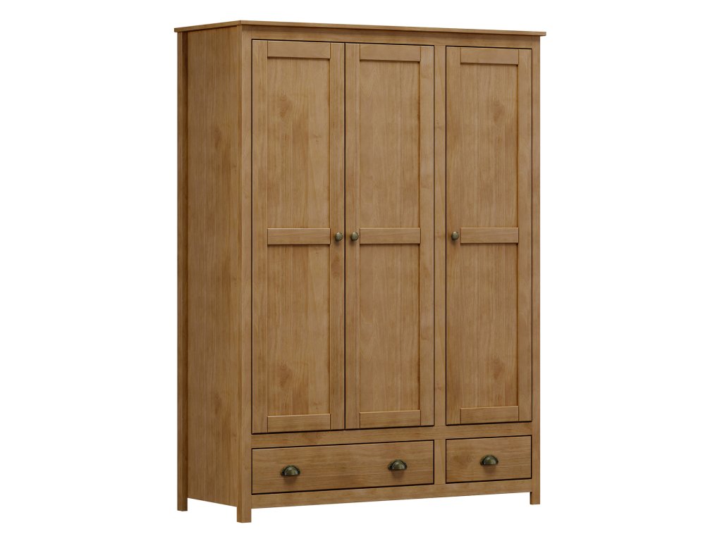 Skříň 3dveřová TOPAZIO dub - materiál masiv borovice, barevné provedení dub dvě zásuvky s kovovými úchytkami a pojezdy v levé části 3 police, v pravé části 1 police a kovová šatní tyčBuďte první, kdo napíše příspěvek k této položce.