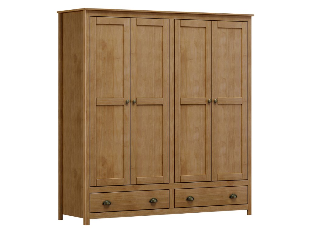 Skříň 4dveřová TOPAZIO dub - materiál masiv borovice, barevné provedení dub dvě zásuvky s kovovými úchytkami a pojezdy v levé části 3 police, v pravé části 1 police a kovová šatní tyčBuďte první, kdo napíše příspěvek k této položce.