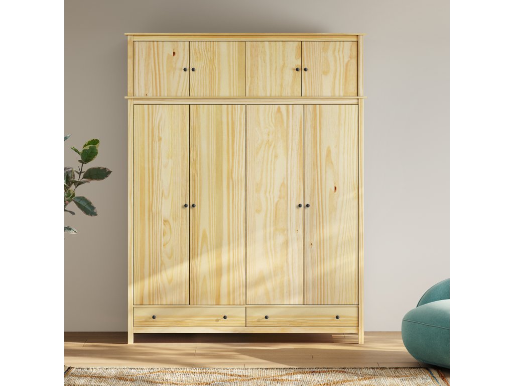 Skříň 4dveřová TORINO kovové úchytky - materiál masiv borovice, lakované provedení kovové úchytky v barevném provedení černěná mosaz prostor dělený na poloviny v levé polovině šatní tyč a police na klobouky v pravé polovině 3 police ve spodní části 2 zásuvky s kovovými pojezdy doporučený nástavec 8168KBuďte první, kdo napíše příspěvek k této položce.
