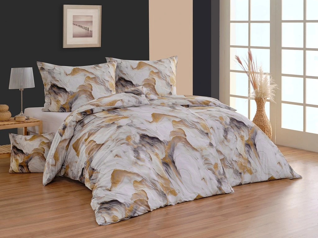 Solara Bavlna deluxe DIGITÁL 1x 140/220, 1x 70/90 - Bavlněné povlečení Solara v paletě krémových a šedých tónů s jemnými zlatavými akcenty najde své místo v moderním i klasickém interiéru. Vzor inspirovaný strukturou přírodního kamene působí přirozeně a zároveň velmi elegantně. Plynulé přechody barev a propracované detaily dodávají designu hloubku a nadčasový charakter. O precizní detail potisku se postarala nejmodernější digitální tisková technologie. Materiál: 100% bavlna Povlak na polštář i na přikrývku je z obou stran stejný, vrchní stranu povlaku na polštář zdobí malé logo "M" v pravém dolním rohu. Povlečení je opatřeno komfortním zipovým uzávěrem. bonieDoplňkové parametry