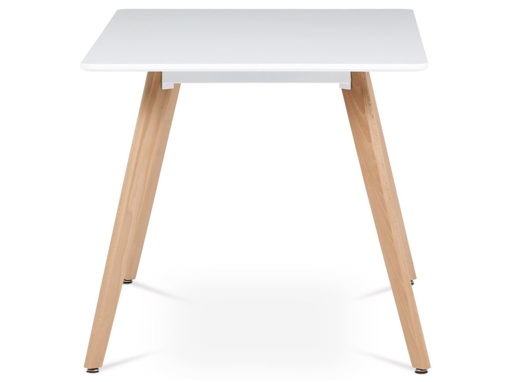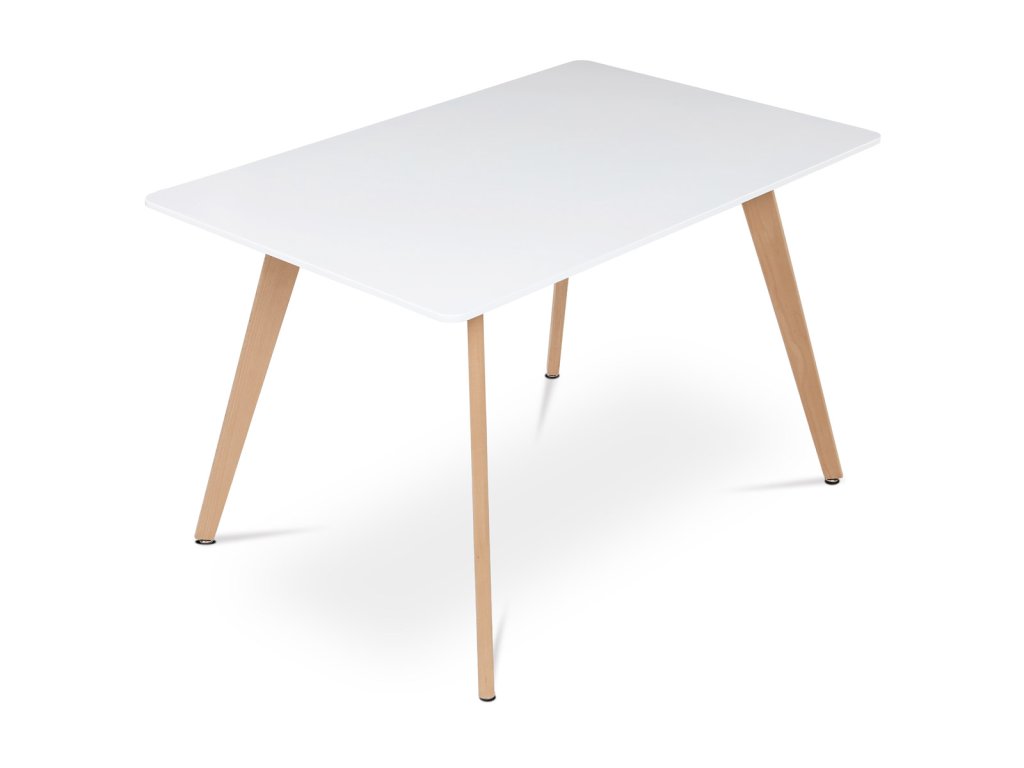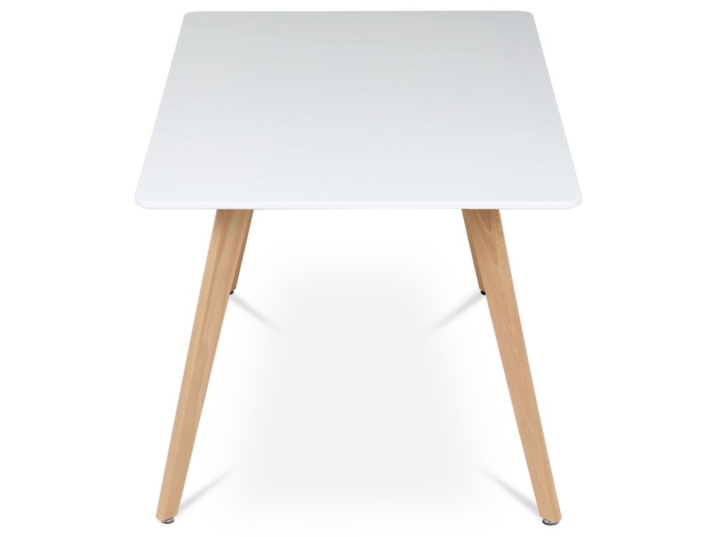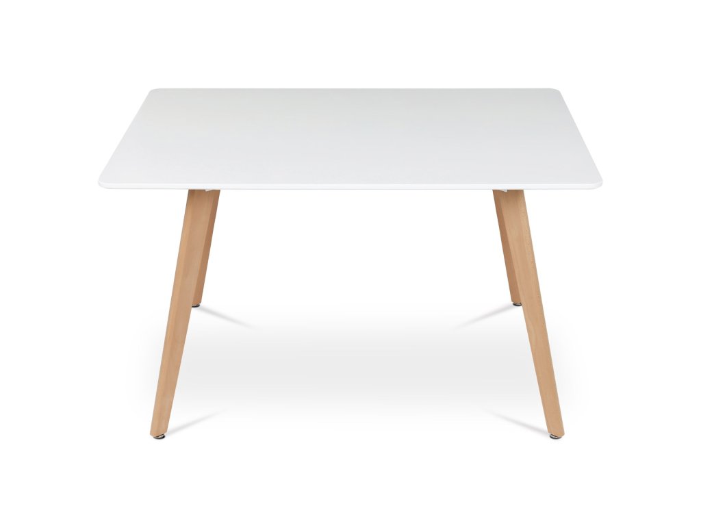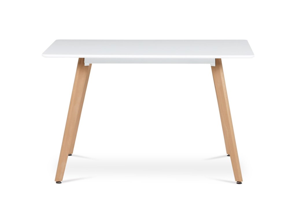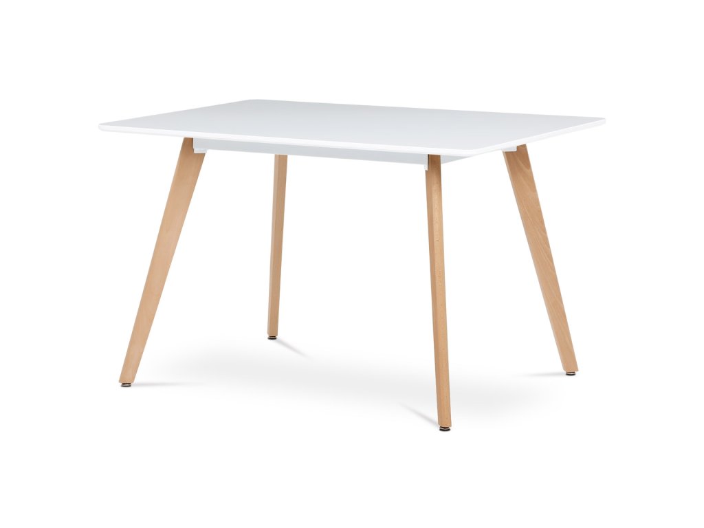 Stůl jídelní, 120x80x74 cm, MDF, masiv / kovová konstrukce, bílá DT-313 WT - Jídelní stůl o rozměrech 120x80x74 cm kombinuje pevnou desku z MDF s matnou bílou povrchovou úpravou a nohy z masivního buku, které dodávají stabilitu a přírodní vzhled. Deska stolu je navržena s jemně zaoblenými rohy pro bezpečnost a pohodlí při používání. Masivní bukové nohy jsou vybaveny rektifikačními patkami, které umožňují vyrovnání nerovností podlahy a zajišťují stabilitu stolu. Matný lak na desce usnadňuje údržbu a odolává běžnému opotřebení. Stůl je pevný a vhodný pro každodenní použití v jídelnách i kuchyních.Doplňkové parametry
