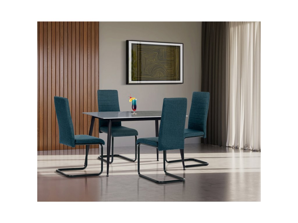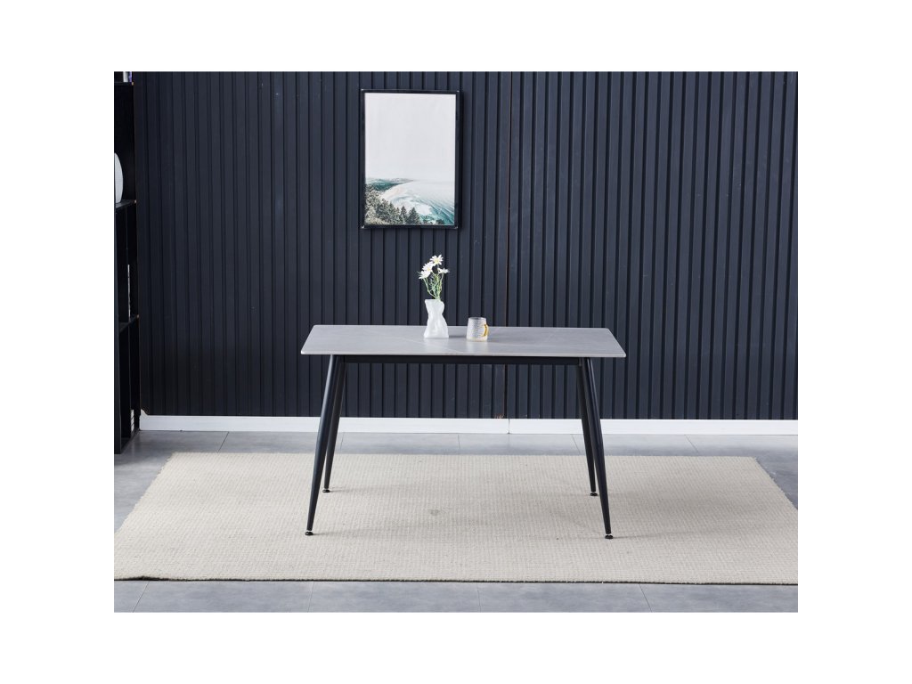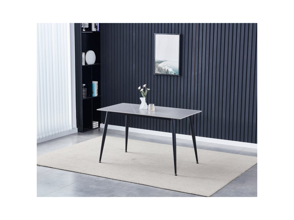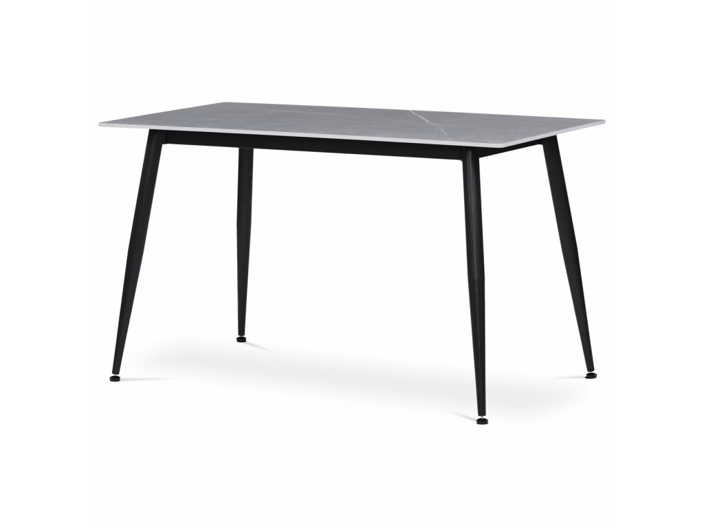 Stůl jídelní, 130x70x76 cm, keramika, kov, šedá, černá HT-403M GREY - Jídelní stůl s rozměry 130x70x76 cm nabízí desku z kvalitní slinuté keramiky v imitaci matného šedého mramoru, která je odolná vůči poškrábání a snadno se udržuje. Černé kovové nohy s mírně zkoseným tvarem zajišťují stabilitu a pevnost celé konstrukce, přičemž jejich povrchová úprava zabraňuje korozi. Zaoblené rohy desky přispívají k bezpečnosti a zároveň dodávají moderní vzhled. Stůl je vhodný pro každodenní použití v jídelnách i kuchyních, kde oceníte kombinaci praktičnosti a stylového designu. Díky pevnému materiálu a kvalitnímu zpracování je navržen pro dlouhou životnost.Doplňkové parametry