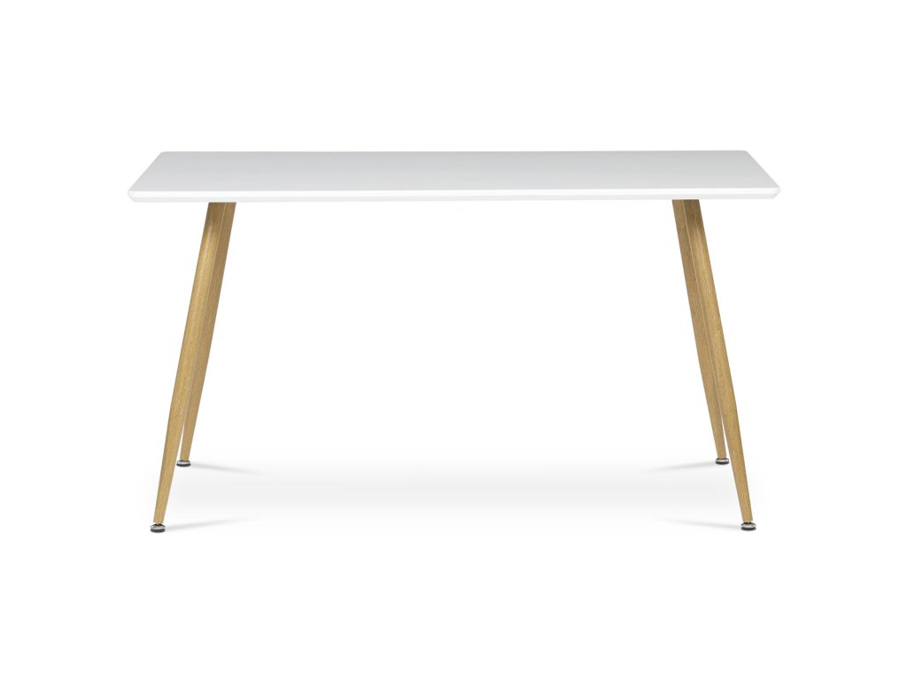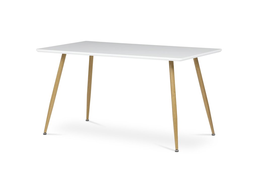 Stůl jídelní, 140x80x76, MDF, kov, bílá, imitace dubu HT-W1214 WT - Jídelní stůl značky Autronic v minimalistickém skandinávském stylu přináší lehkost a eleganci do každého interiéru. Bílá matná deska z MDF materiálu je odolná a snadno udržovatelná, zatímco stabilní kovové nohy v dekoru přírodního dubu dodávají stolu šarm. Díky svému kompaktnímu rozměru je ideální pro menší jídelny nebo kuchyně. Praktické kónické nohy s kyvnými kluzáky zajistí stabilitu i na nerovném povrchu. Tento stůl je perfektní volbou pro ty, kteří hledají funkčnost spojenou s moderním designem.Doplňkové parametry