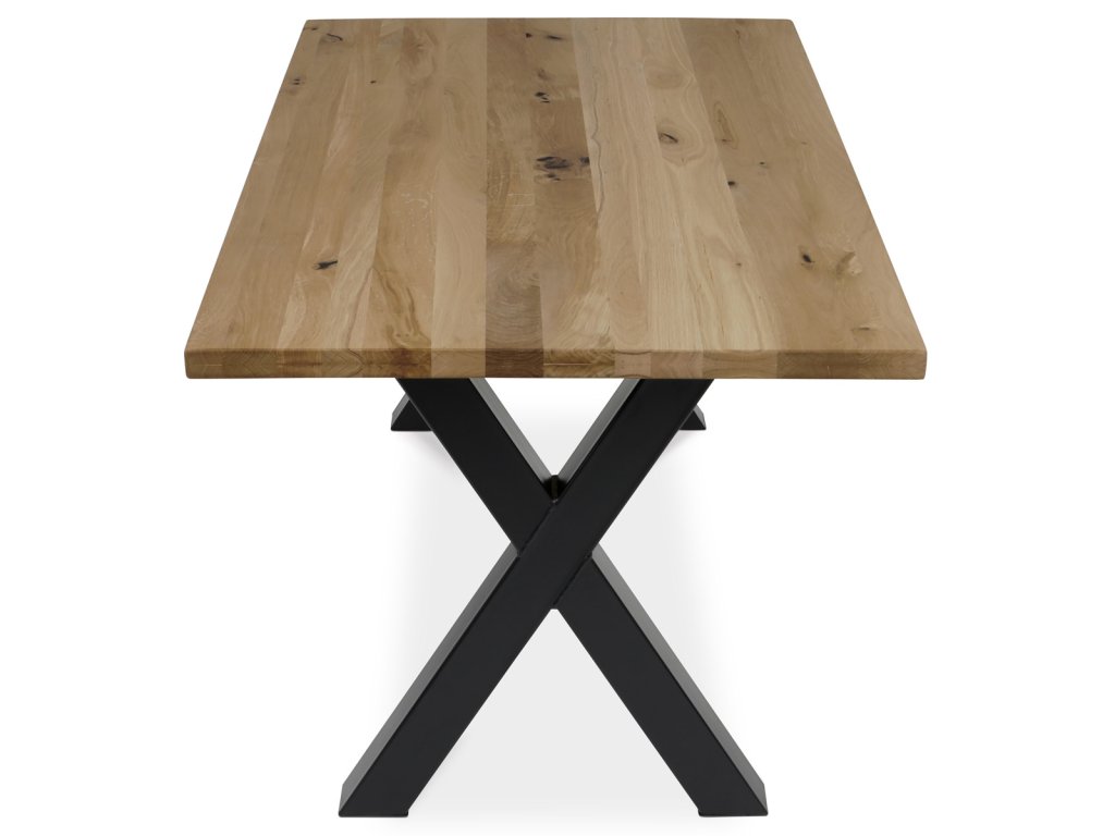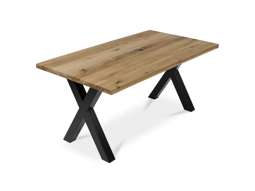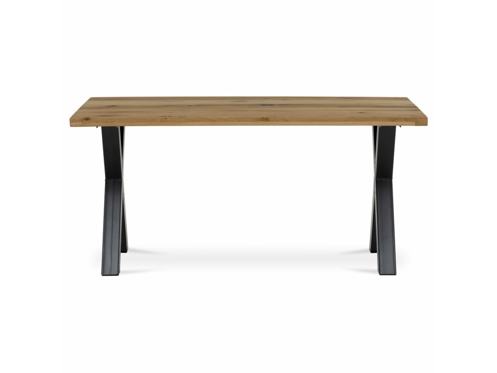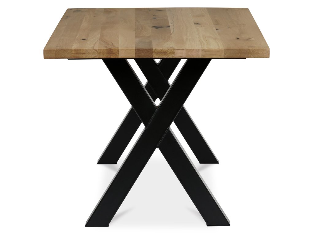 Stůl jídelní, 160x90x75 cm, masiv dub, kov, černá DS-X160 DUB - Jídelní stůl DS-X160 DUB kombinuje přírodní krásu masivního dubového dřeva s moderní stabilitou kovové podnože v černém provedení. Deska stolu o rozměrech 160 × 90 cm je vyrobena z masivu s olejovaným povrchem, který zvýrazňuje přirozenou strukturu a barevné odstíny dubu, zároveň usnadňuje údržbu a chrání dřevo. Robustní kovová podnož ve tvaru kříže zajišťuje pevnost a stabilitu celé konstrukce, což přispívá k dlouhé životnosti a bezpečnému používání. Výška stolu 75 cm odpovídá standardním ergonomickým parametrům pro pohodlné sezení u jídelního stolu. Tento model je ideální volbou pro ty, kteří hledají kombinaci tradičního materiálu a industriálního designu s důrazem na kvalitu a funkčnost.Doplňkové parametry