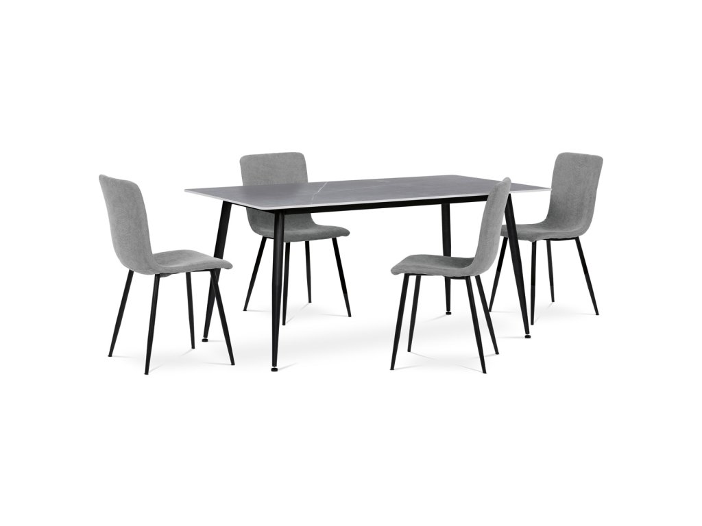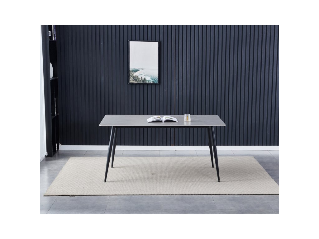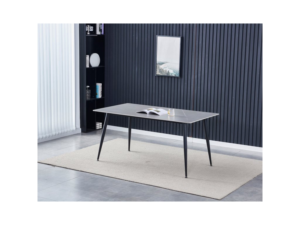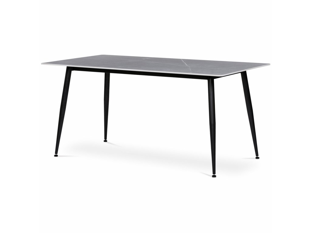 Stůl jídelní, 160x90x76 cm, keramika, kov, šedá, černá HT-406M GREY - Jídelní stůl o rozměrech 160x90x76 cm kombinuje moderní design s praktickými vlastnostmi. Deska je vyrobena ze slinuté keramiky v imitaci matného mramoru, která nabízí pevný a odolný povrch snadno udržovatelný v čistotě. Černé kovové nohy jsou tvarované do mírně zúžených sloupků, které zajišťují stabilitu a pevnost celé konstrukce. Matná povrchová úprava desky podtrhuje elegantní vzhled a zároveň minimalizuje odlesky. Stůl je vhodný pro každodenní použití v jídelnách i moderně zařízených interiérech.Doplňkové parametry