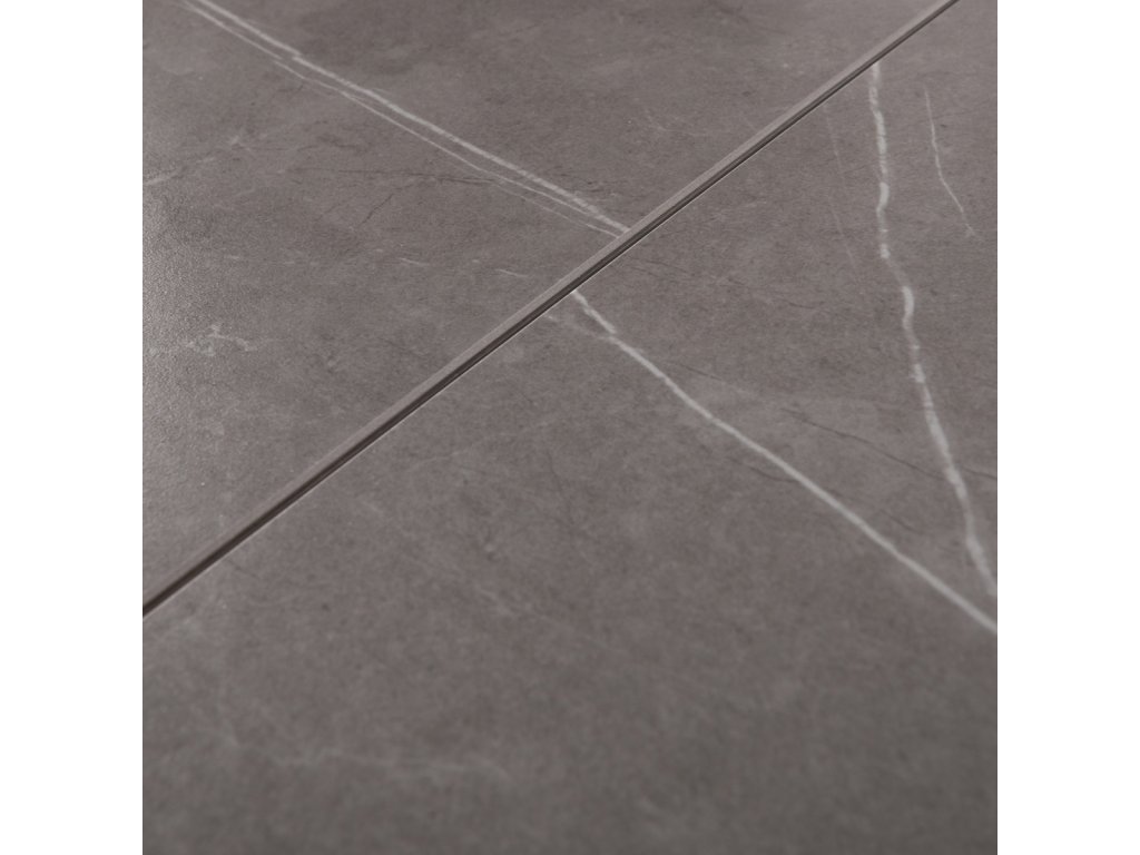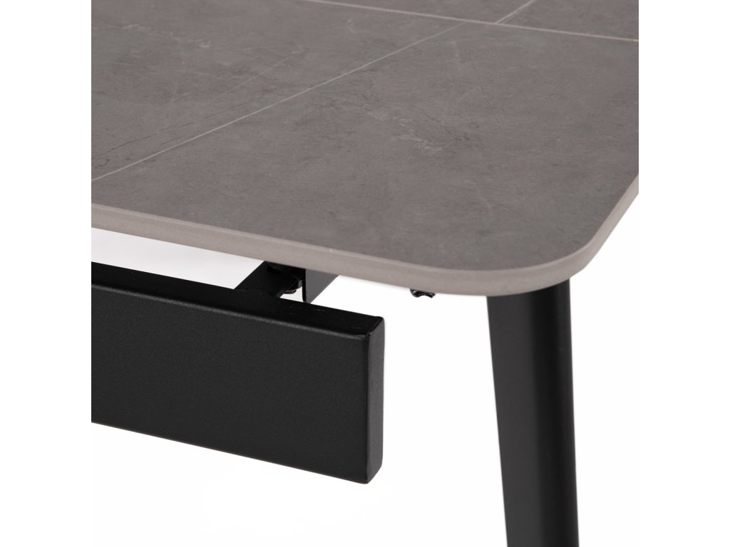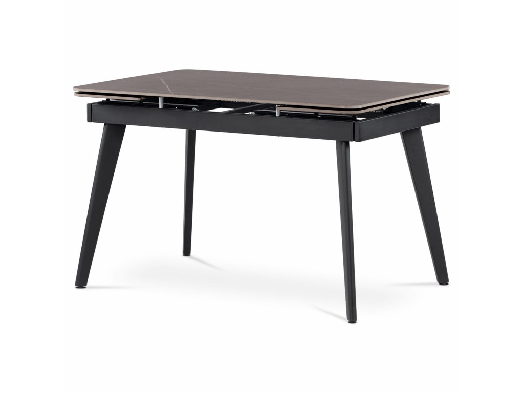 Stůl jídelní rozkládací, 120+30+30x80x74 cm, keramika, kov, šedá, černá HT-405M GREY - Jídelní stůl s rozkládací funkcí nabízí praktické řešení pro flexibilní uspořádání prostoru. Deska je vyrobena ze slinuté keramiky v šedém mramorovém dekoru s matným povrchem, který je odolný vůči poškrábání a snadno se udržuje. Stabilní kovové nohy v černém matném laku zajišťují pevnou oporu a dlouhou životnost. Rozkládací mechanismus umožňuje prodloužení stolu o dvě přídavné desky, čímž se zvětší pracovní plocha z 120 na 180 cm při zachování šířky 80 cm. Díky kombinaci kvalitních materiálů a funkčnímu designu je stůl vhodný jak do moderních interiérů, tak pro každodenní použití.Doplňkové parametry