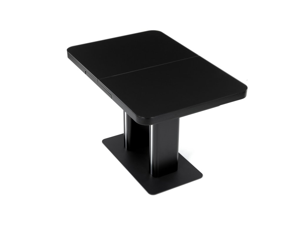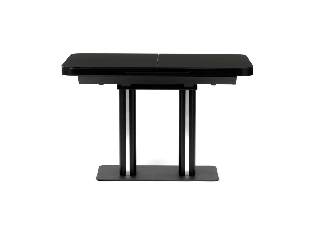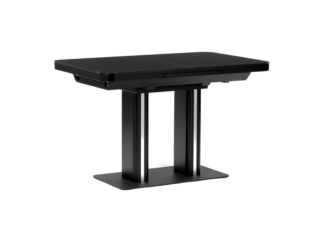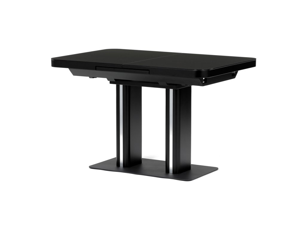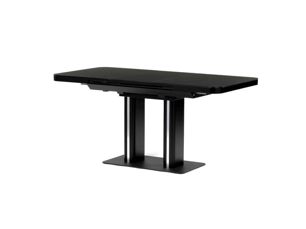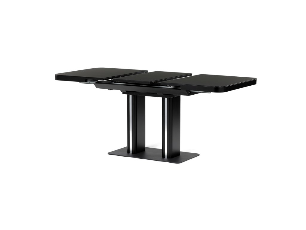 Stůl jídelní rozkládací, 120+40x80x75 cm, MDf, tvrzené sklo, černá HT-D1926 BK - Jídelní rozkládací stůl HT-D1926 BK značky Autronic vyniká moderním designem s černou matnou povrchovou úpravou a praktickým automatickým rozkladem, který zvětšuje pracovní plochu z 120 na 160 cm. Deska stolu je vyrobena z tvrzeného černého skla, které zajišťuje vysokou odolnost proti poškrábání a snadnou údržbu, zatímco konstrukce nohou a rámu je z MDF materiálu s černým matným lakem, což přispívá k pevnosti a stabilitě celého stolu. Zaoblené rohy desky nejen zvyšují bezpečnost při používání, ale také dodávají elegantní vizuální dojem. Mechanismus rozkladu je navržen pro jednoduché a plynulé ovládání, což umožňuje rychlé přizpůsobení velikosti stolu podle potřeby. Stabilní podnož s dvojitými sloupky na podstavci zajišťuje rovnoměrné rozložení hmotnosti a vysokou nosnost, což činí stůl vhodným pro každodenní použití v domácnostech i menších kancelářských prostorách. Celková výška stolu je 75 cm, šířka 80 cm a délka v základním stavu 120 cm, která se po rozložení prodlouží o 40 cm.Doplňkové parametry