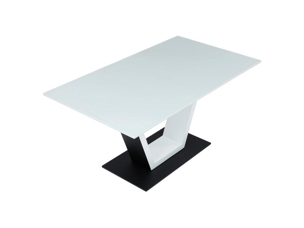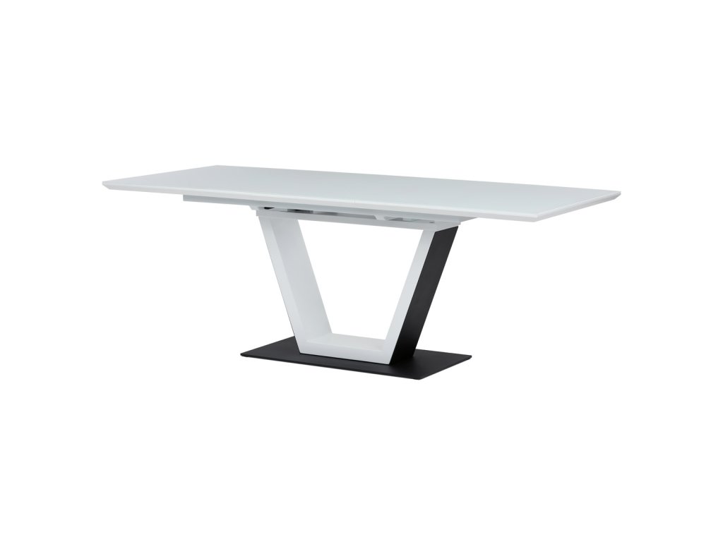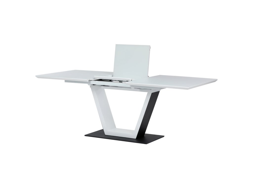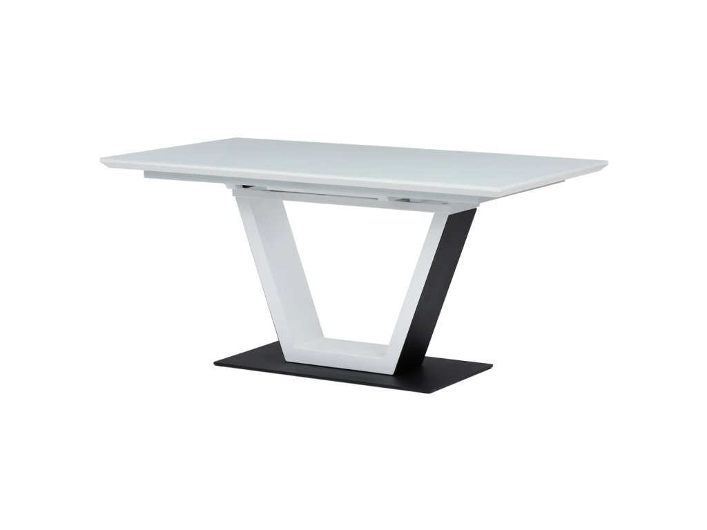 Stůl jídelní rozkládací, 160+50x90x77 cm, MDF, tvrzené sklo, bílá, černá HT-D1931 WT - Luxusní rozkládací jídelní stůl značky Autronic v elegantní bílé barvě je ideální volbou pro moderní interiéry. Obdélníková deska z tvrzeného skla nabízí odolný a snadno udržovatelný povrch. Jedinečný design s centrální podnoží ve tvaru „V“ na stabilní základně dodává stolu výrazný charakter. Díky rozkládacímu mechanismu lze šířku stolu snadno přizpůsobit aktuálním potřebám, což z něj činí perfektní řešení pro rodinné večeře i společenské události. Skvělá kombinace stylu a praktičnosti.Doplňkové parametry