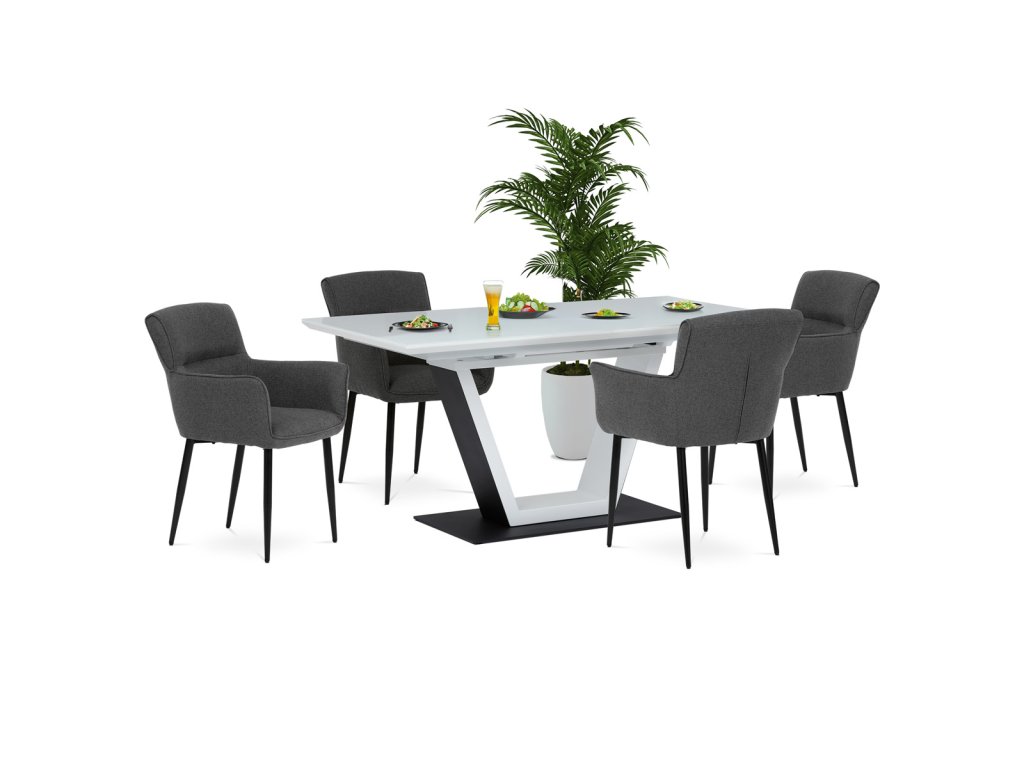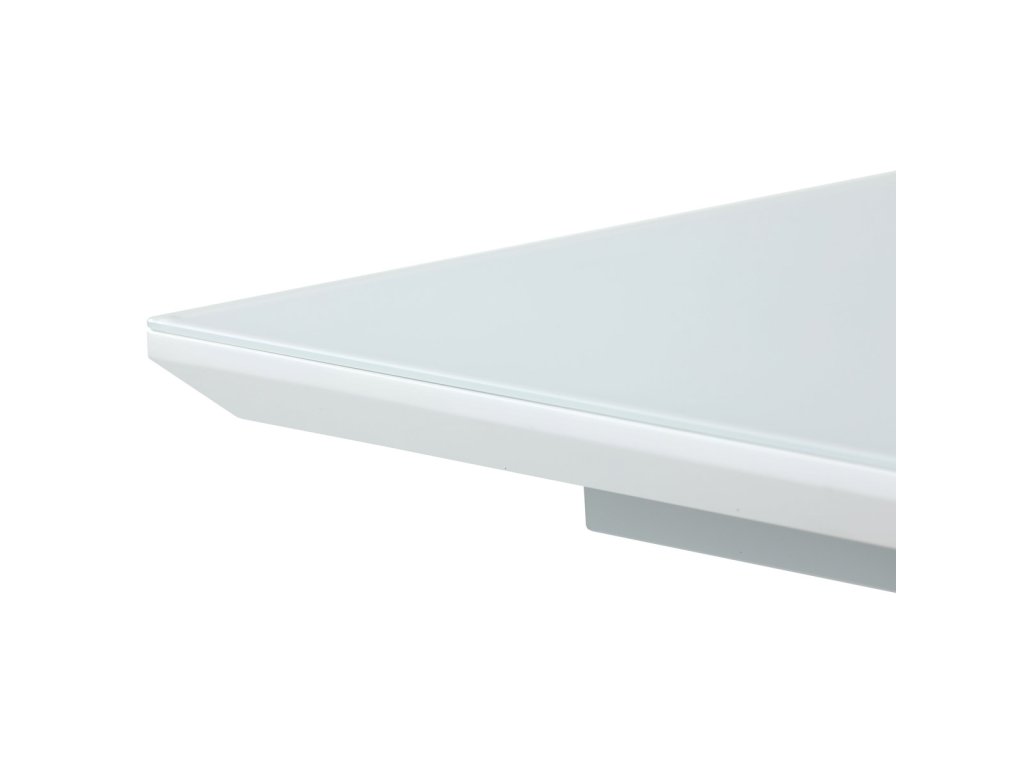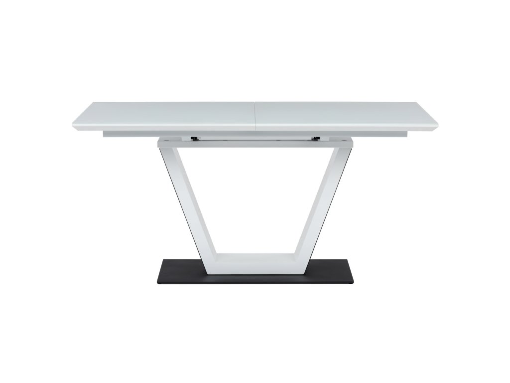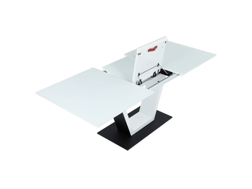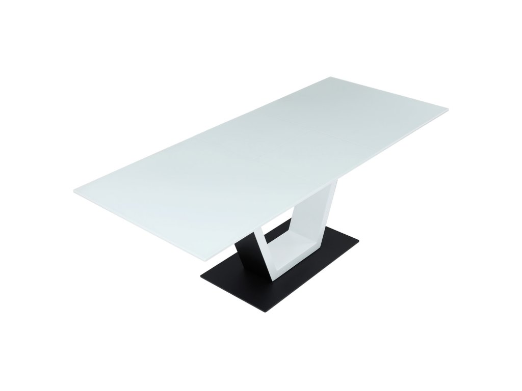 Stůl jídelní rozkládací, 160+50x90x77 cm, MDF, tvrzené sklo, bílá, černá HT-D1931 WT - Luxusní rozkládací jídelní stůl značky Autronic v elegantní bílé barvě je ideální volbou pro moderní interiéry. Obdélníková deska z tvrzeného skla nabízí odolný a snadno udržovatelný povrch. Jedinečný design s centrální podnoží ve tvaru „V“ na stabilní základně dodává stolu výrazný charakter. Díky rozkládacímu mechanismu lze šířku stolu snadno přizpůsobit aktuálním potřebám, což z něj činí perfektní řešení pro rodinné večeře i společenské události. Skvělá kombinace stylu a praktičnosti.Doplňkové parametry