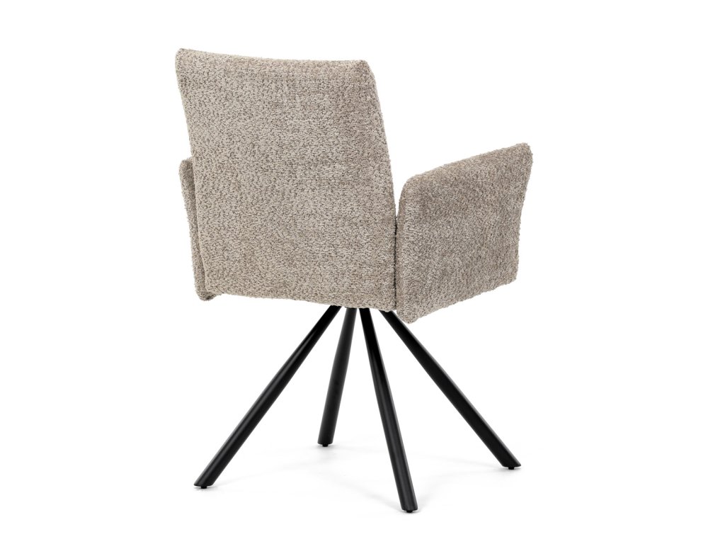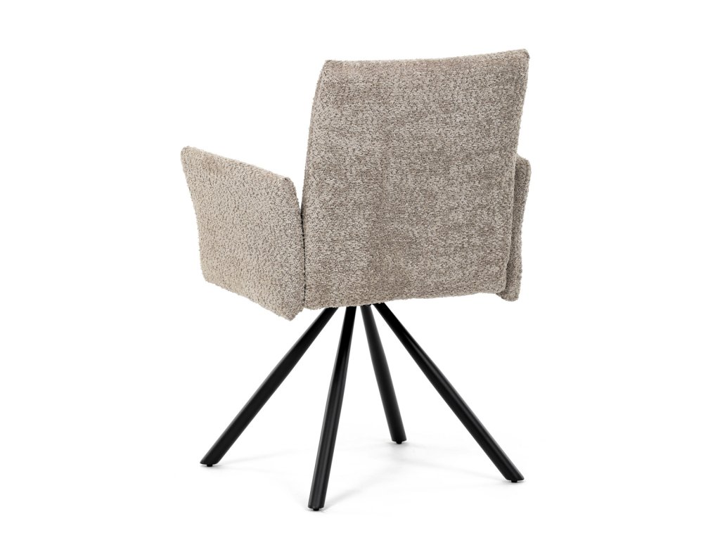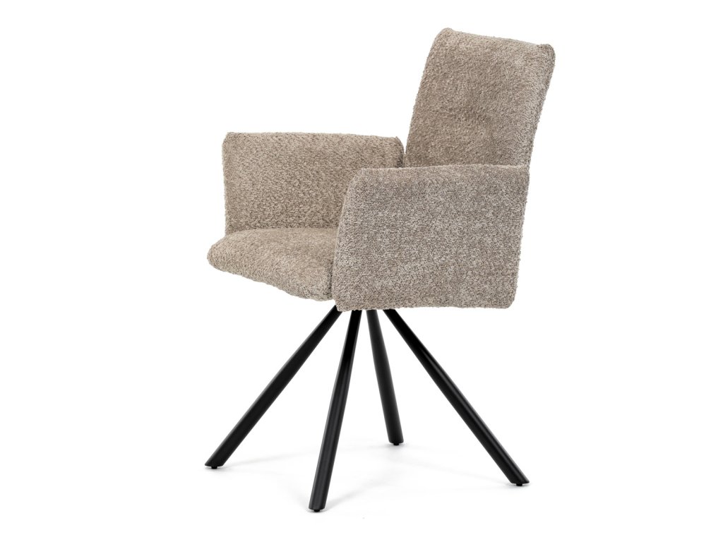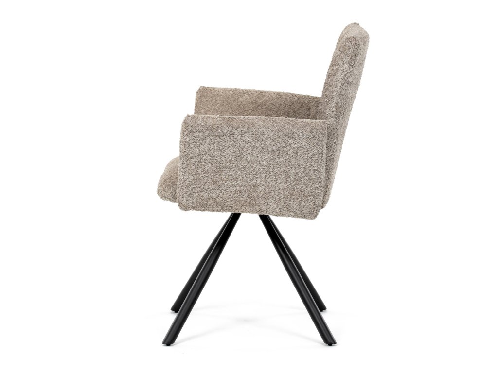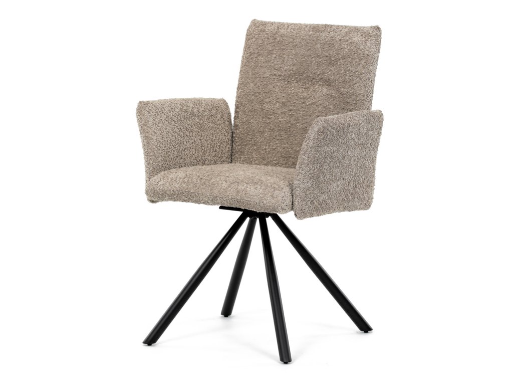 Židle jídelní, lanýžová látka, černý kov, otočný mechanismus 90°/90° (L/P) - funkce reset DCH-W1117 LAN2 - Tato moderní jídelní židle značky Autronic v industriálním stylu kombinuje pohodlí s funkčností. Otočná židle s robustní kovovou podnoží je vybavena pohodlnými područkami a látkou Bouclé, která zajišťuje příjemný a stylový vzhled. Polstrování z PU pěny nabízí měkké sezení, zatímco otočný mechanismus L90°/P90° s funkcí automatického vracení sedáku do základní polohy umožňuje snadné otáčení pro maximální flexibilitu. Černá kovová centrální podnož dodává židli stabilitu a moderní vzhled. Tato židle je ideální pro elegantní jídelny, kde se kombinuje komfort s moderním designem.Doplňkové parametry