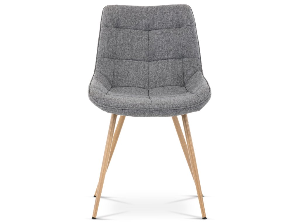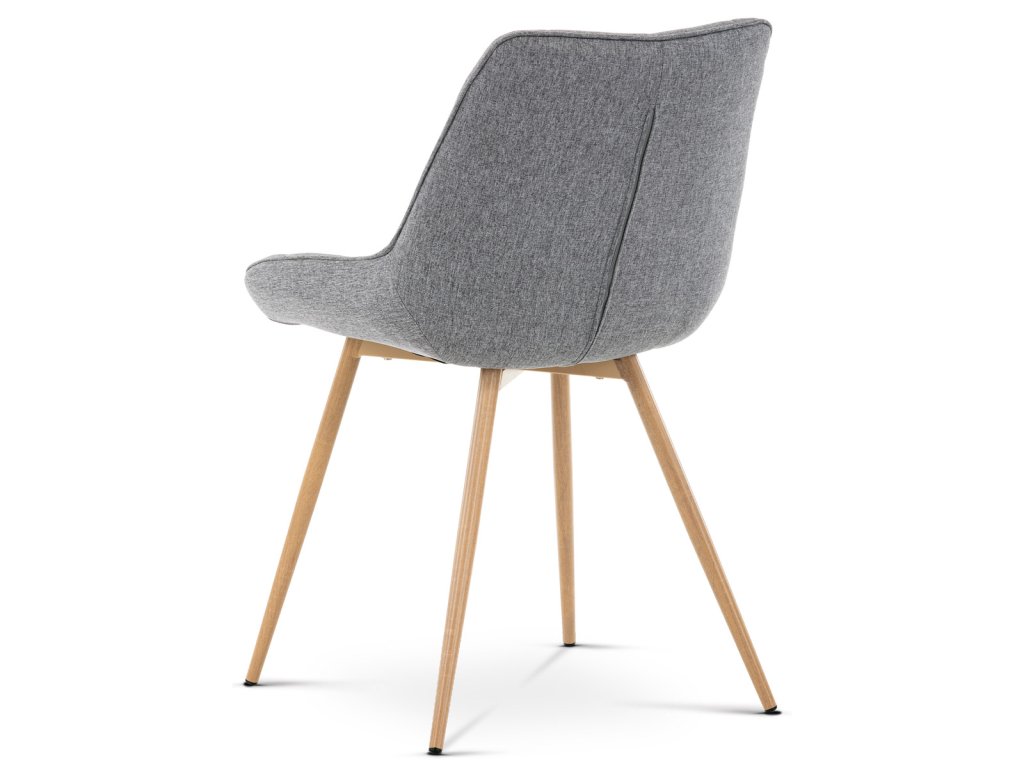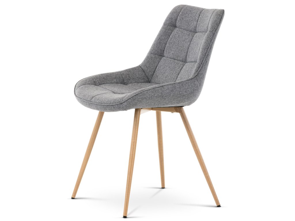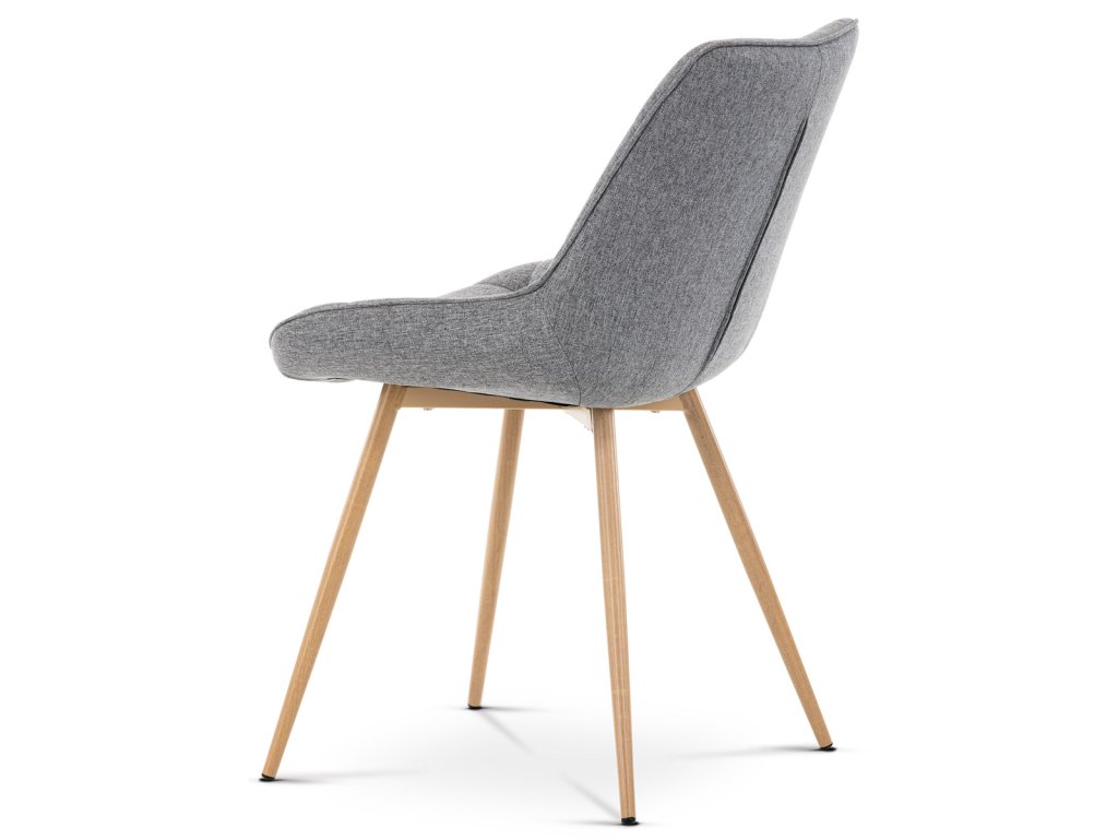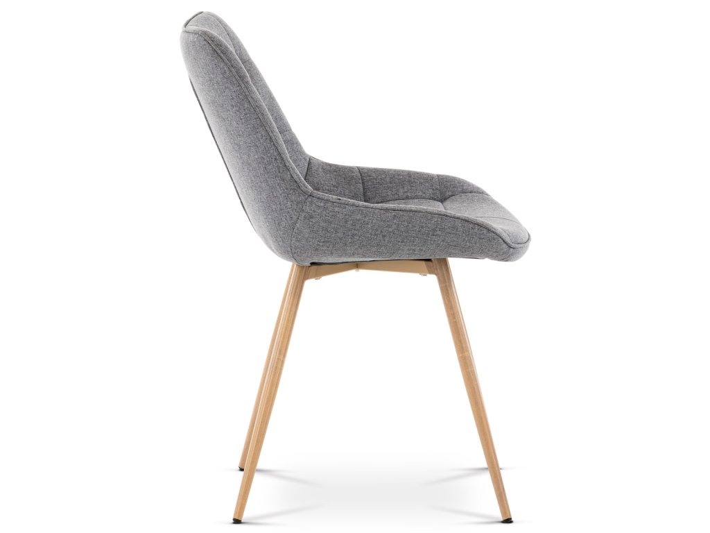 Židle jídelní, šedá látka, kovové nohy, 3D dekor dub CT-394 GREY2 - Jídelní židle CT-394 GREY2 kombinuje moderní design s pohodlím díky čalounění v šedé látce s výrazným designovým prošitím, které zdůrazňuje tvarované sedadlo a opěradlo. Pevné kovové nohy v dekoru dubu zajišťují stabilitu a dlouhou životnost, přičemž jejich povrchová úprava dodává židli přírodní vzhled. Židle nemá područky ani otočný mechanismus, což ji činí praktickou a snadno umístitelnou do různých prostorů. Ergonomicky tvarované sedadlo podporuje pohodlné sezení při jídelních aktivitách. Díky kvalitnímu zpracování a použitým materiálům je židle vhodná pro každodenní použití v domácnostech i komerčních prostorách.Doplňkové parametry